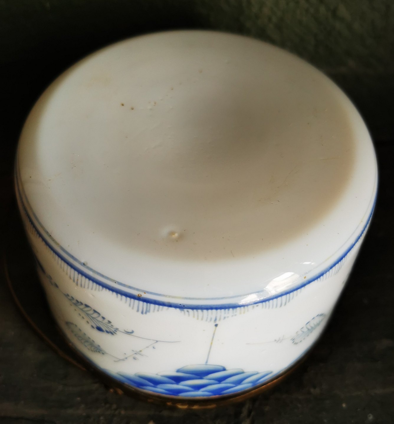 Skål i opalineglas med blå musselmalet decoration. Metal montering med hank. I god stand. Fremstillet omkring 1910. Mål: H. 7 cm Ø. 11 cm.