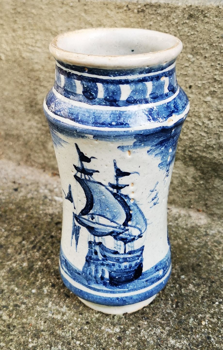 Spansk Albarello hvidglaseret krukke i fajance med blåt tekst samt motiv af spansk galleon sejlskib fra 18. århundrede. Fremstår i god stand uden skader eller reparationer. Almindeligt brugsslid. H. 16½ cm høj