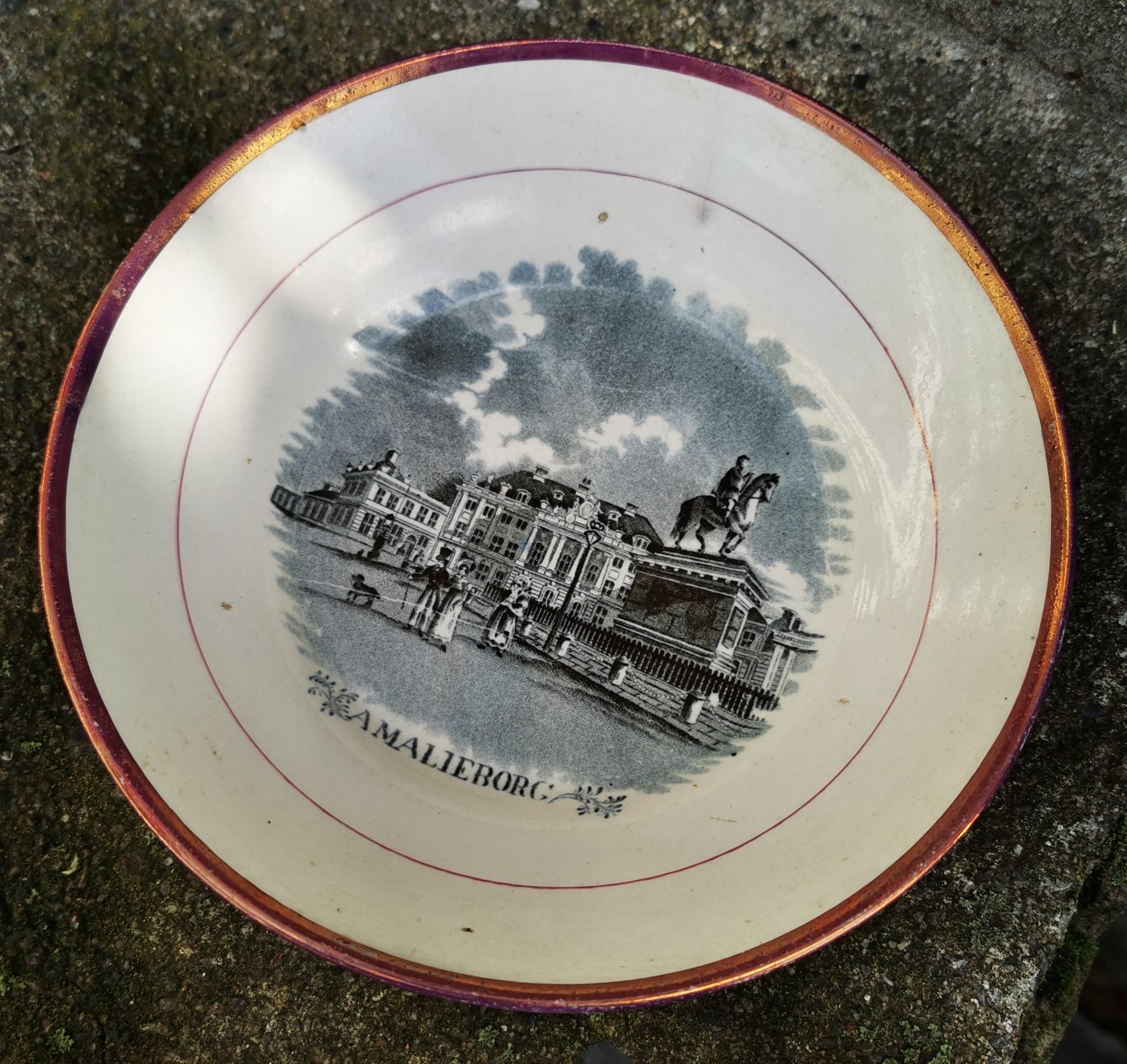 Meget stor morgenkop i fajance med københavnske motiver. Rosenborg Slot, Kongens Nytorv samt Amalienborg i bunden af underkoppen. Fremstår i god stand. Fabriksmærket (et indtrykt anker) på bunden. Mål: Koppen er 7 cm høj og åbningens diameter er 12-12½ cm. Underkoppen er 4 cm høj og har åbningsdiameter på 18½ cm.