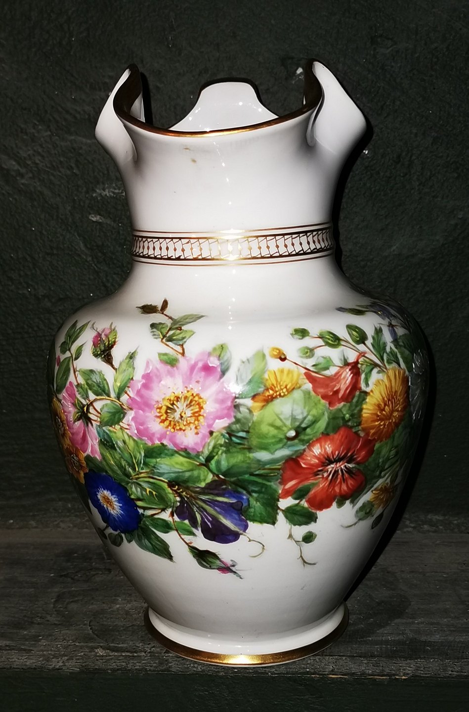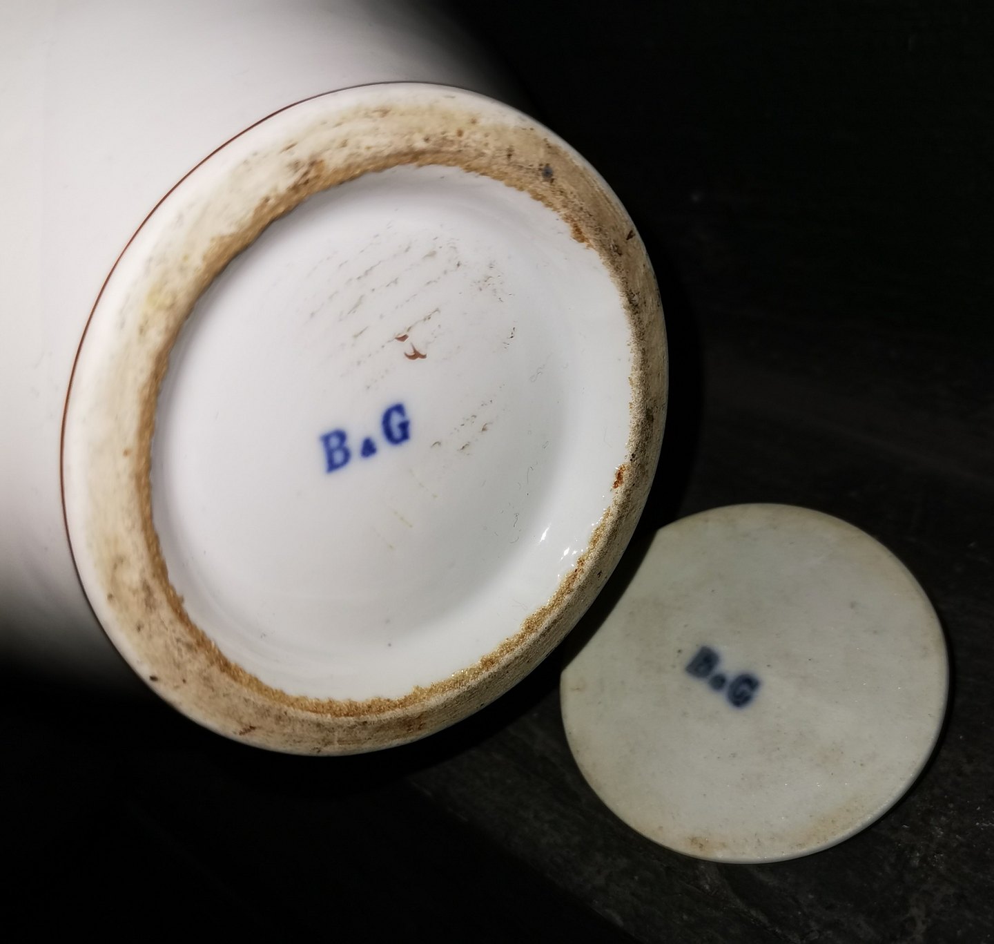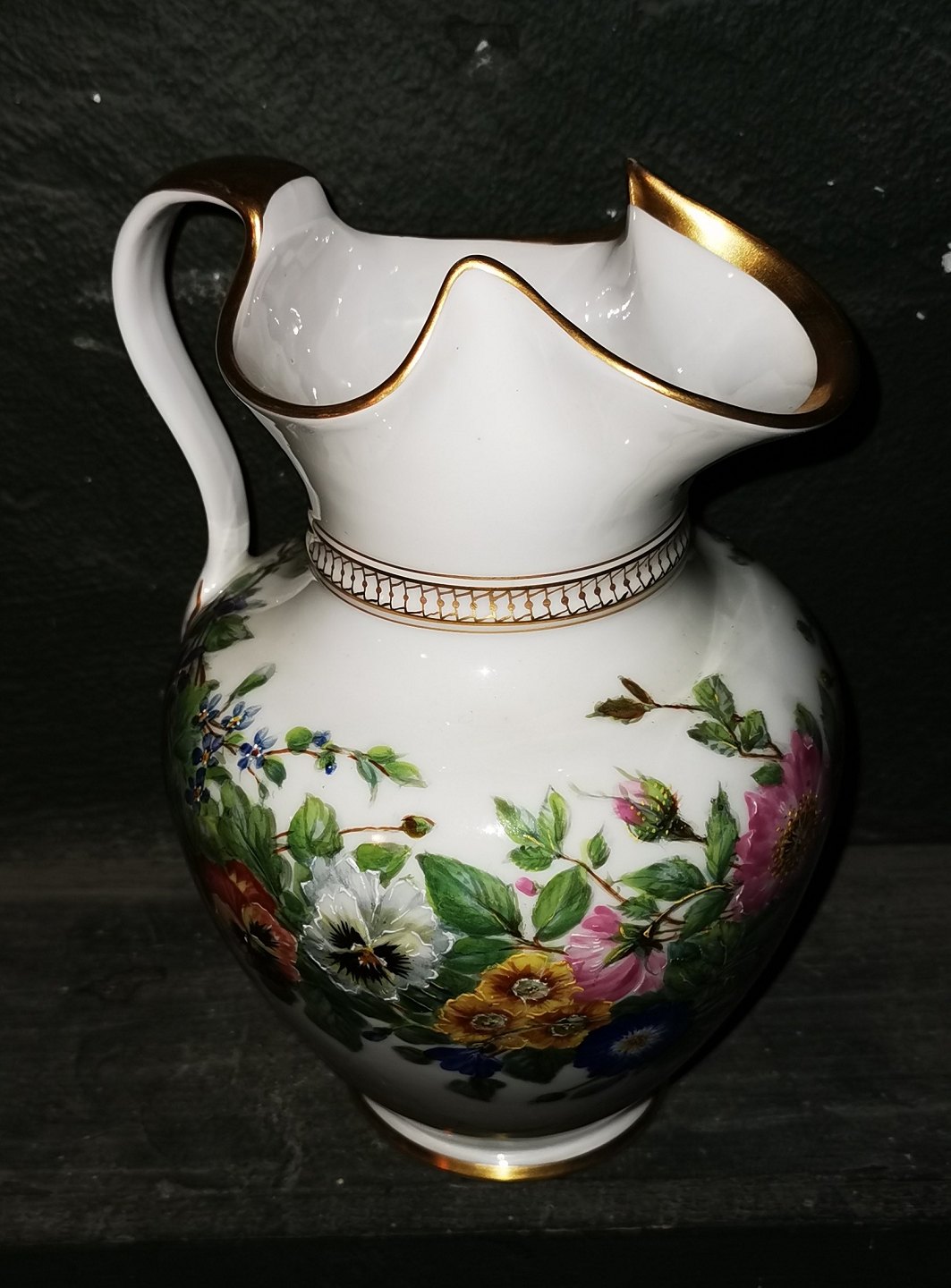 Chokoladekande i porcelæn fra Bing & Grøndahl. Fremstillet i slutningen af 19. århundrede omkring 1880. Dekorations i overglasur med farvestærke blomster. Ingen nævneværdig slid på hverken blomster eller guldet. Låg og kandens bund fabriksmærket med B&G i blåt. Fremstår således i perfekt stand uden skader eller reparationer. H. 23 cm.