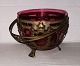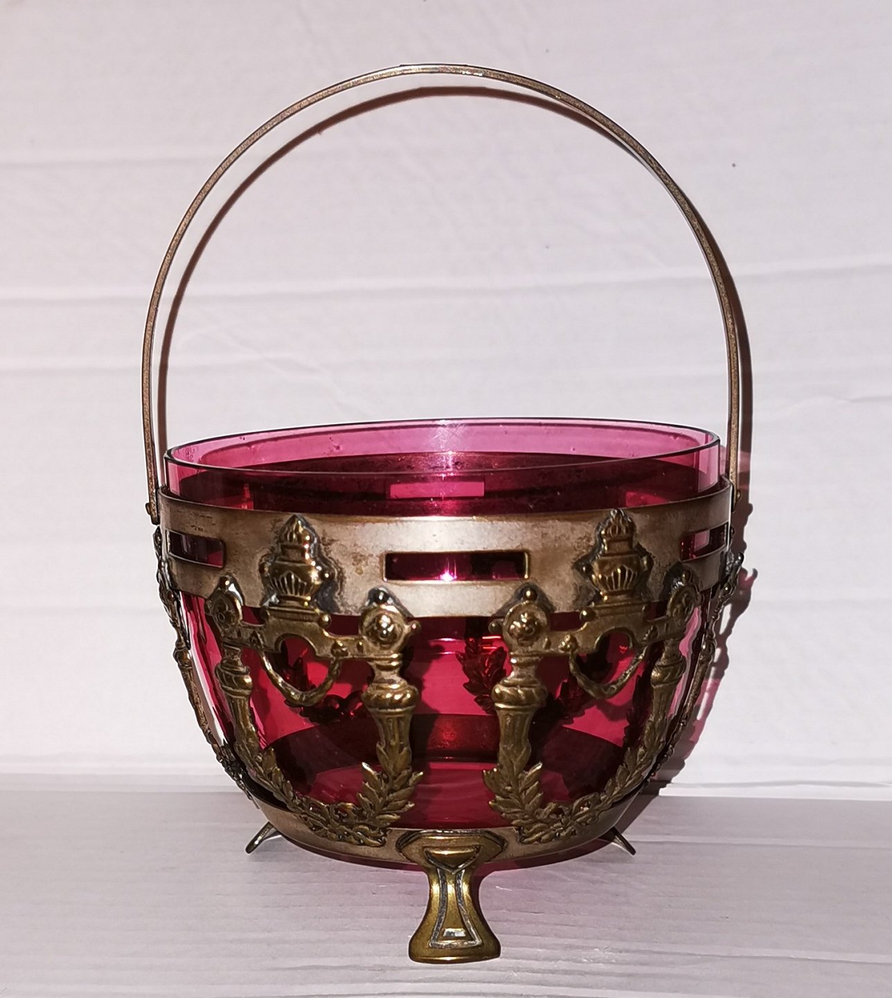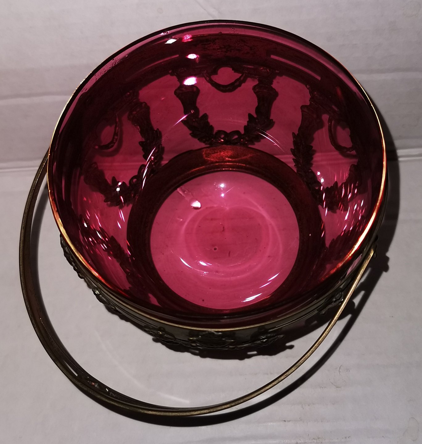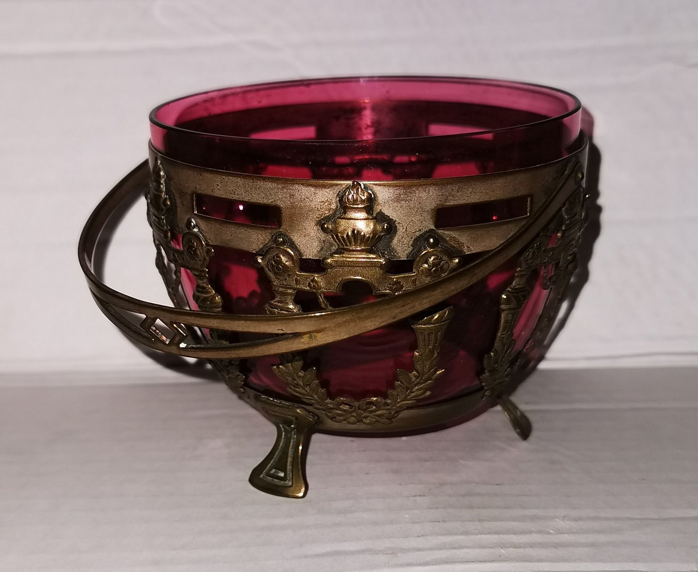 Sukkerskål i lyserødt glas, der sidder i metalholder med hank. Fremstillet omkring 1900. Naturlig overflade brugsspor på metallet. Glasskålen er i perfekt stand. Mål: 9 cm (3.54 inches) høj og åbningsdiameter på 10½ cm (4.13 inches).