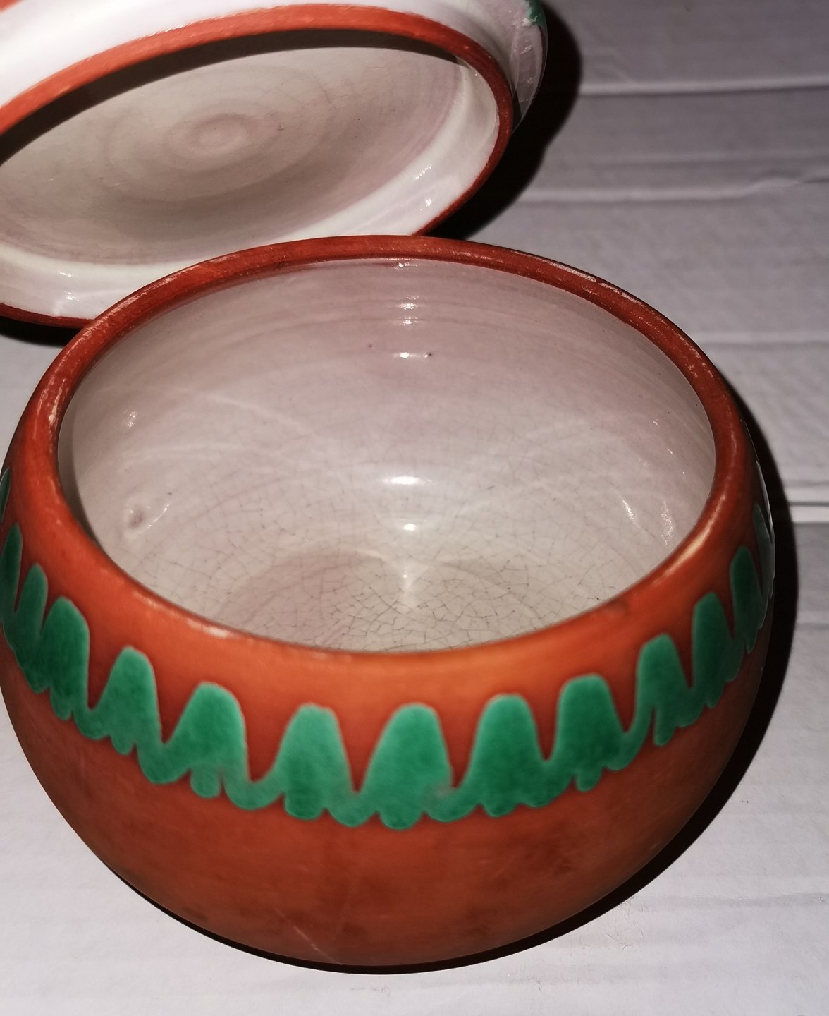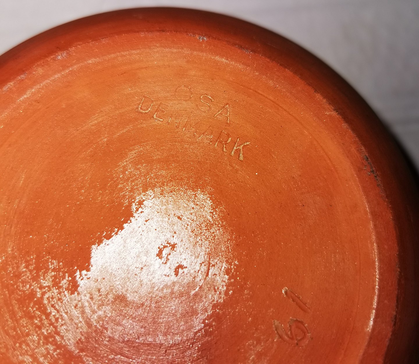 Lågskål i keramik med glaseret dekoration fra OSA. Fremstillet i 1950´erne. Hvidglaseret indvendigt. Fremstår i god stand uden skader eller reparationer. H. 10½ cm (4.13 inches)
