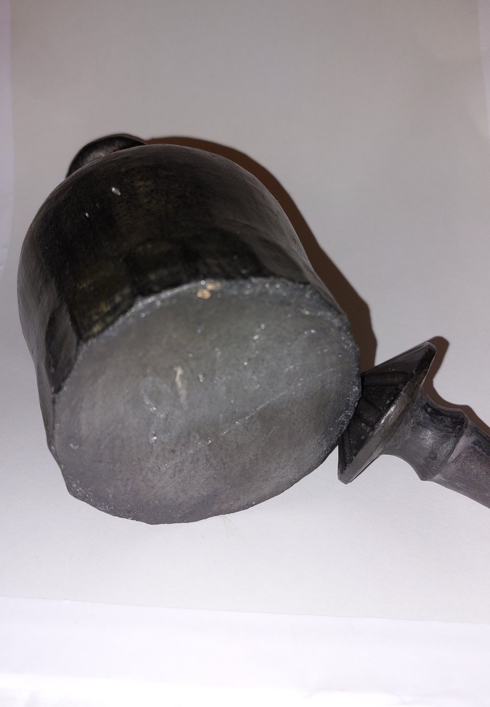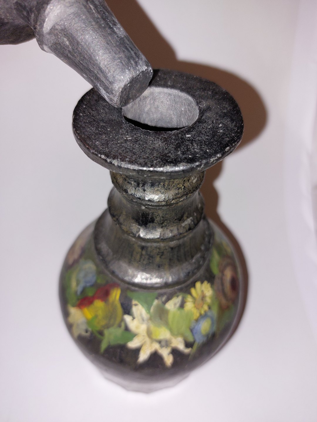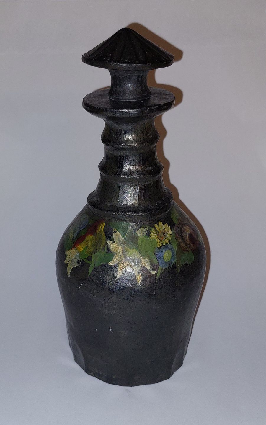 Jydepotte karaffel med prop. Blomsterdekoreret på skuldrene. Modelleret efter Holmegaard´s karaffel med skærmprop og blomsterbemalet karraffel fra midt i 19. århundrede. Hvor gammel denne karaffel er vides ikke. Kender ikke til lignende arbejder. I god stand uden skader eller reparationer. H. 22½ cm