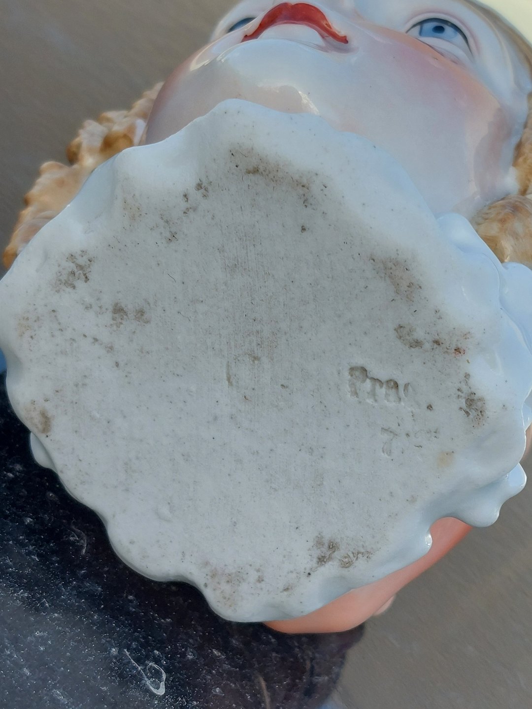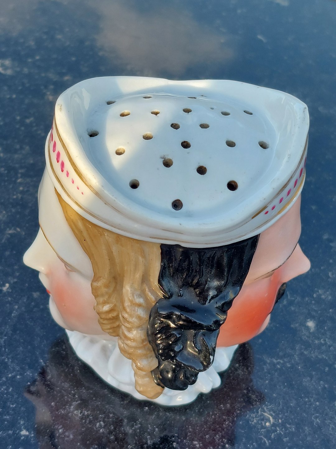 Figurativ strødåse i porcelæn med motiv af ansigterne af en Konge og hans Dronning. Formodes fremstillet omkring 1840-1860. På bunden er der indstemplet "Prag". I god stand uden skader eller reparationer. H. 9½ cm (3.74 inches).