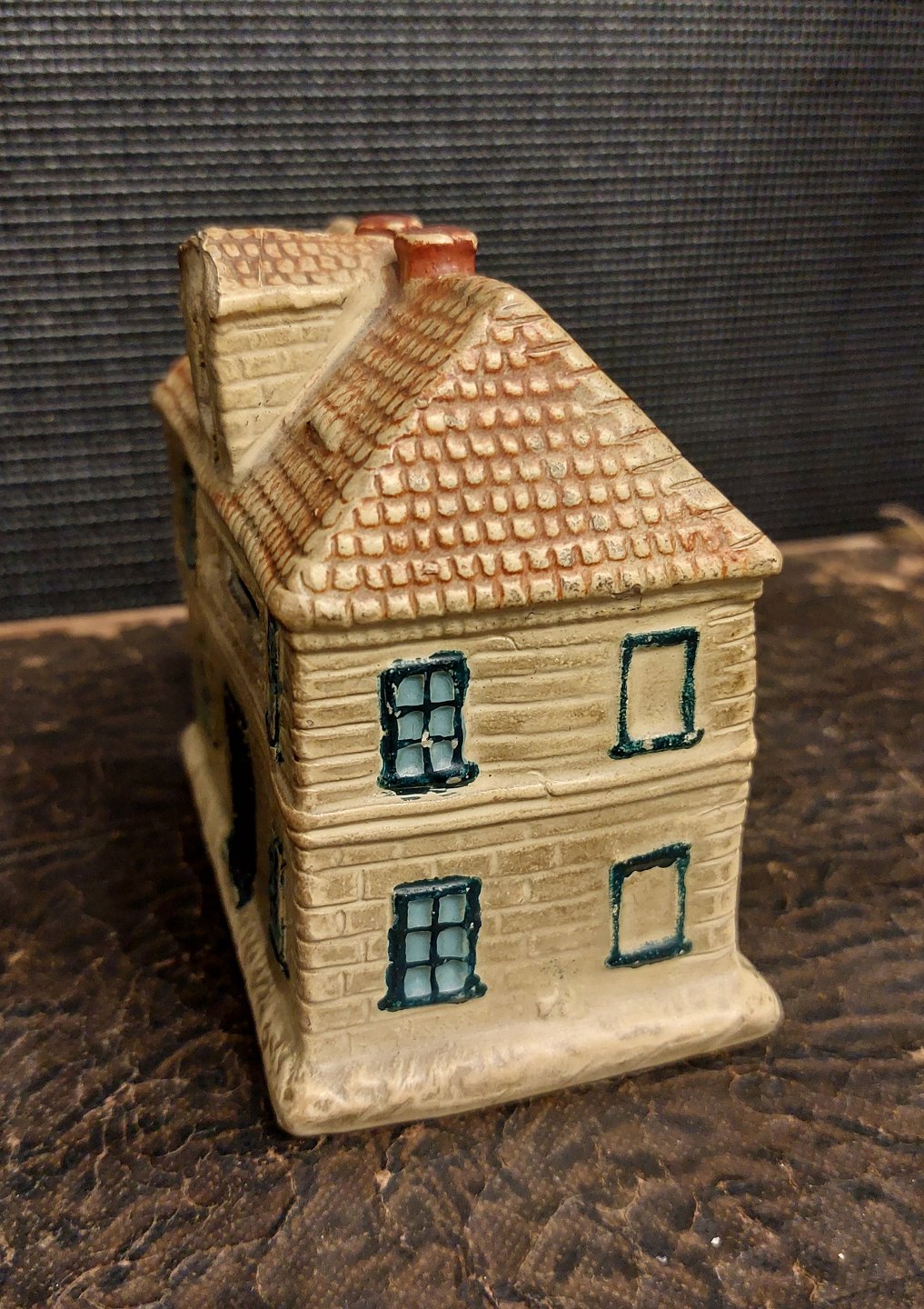 Sparebøsse I keramik i form af et hus. Mindre skår ved vinduet øverst. H. 10,5 cm. Bundenmåler 6,5 x 10,5 cm