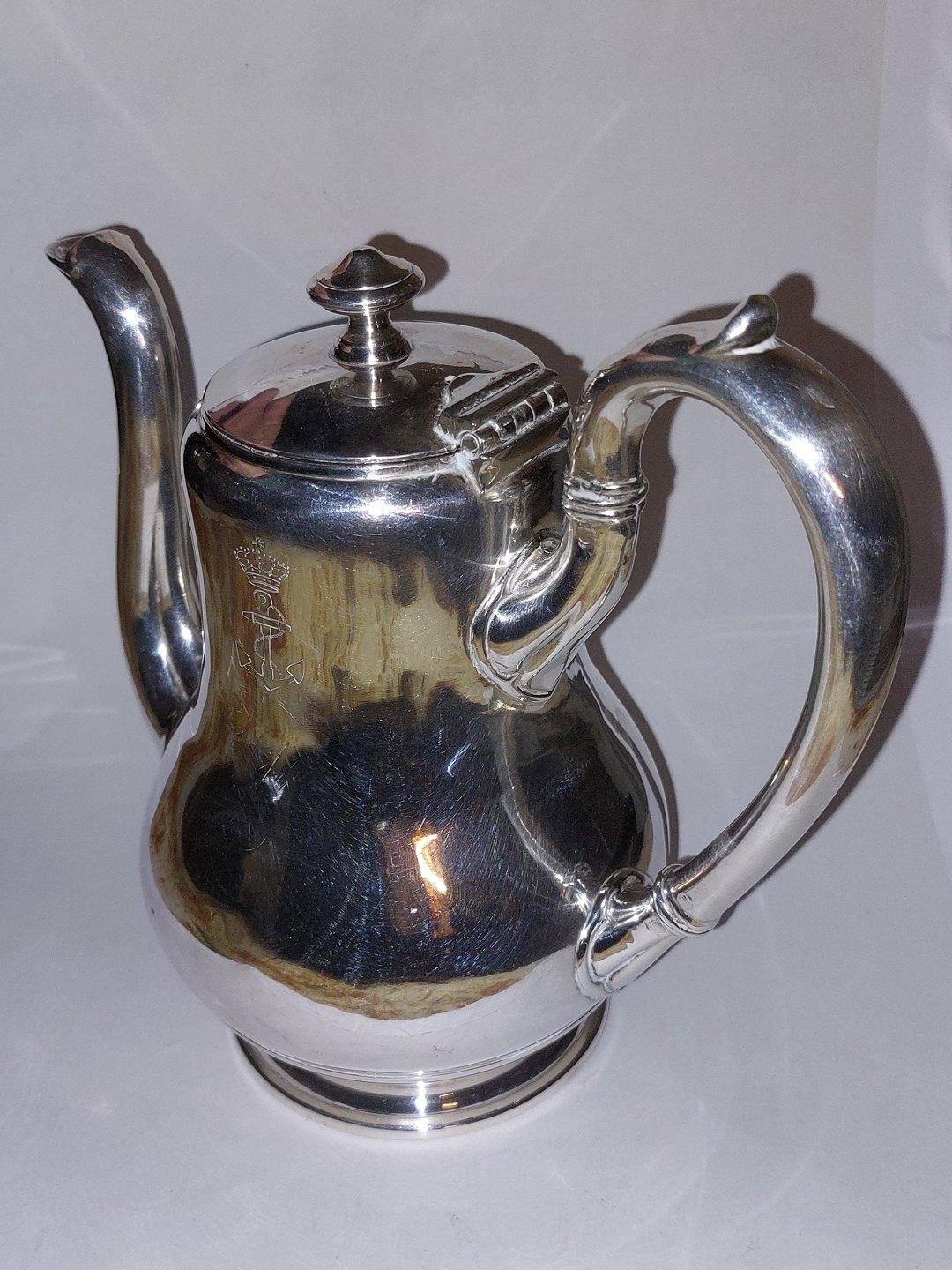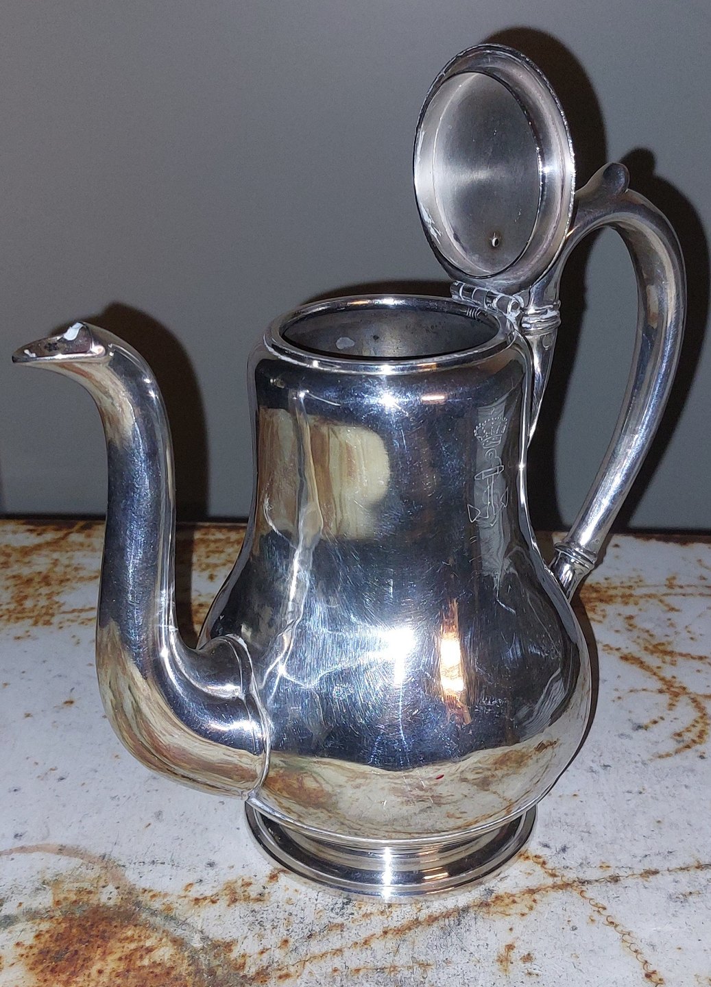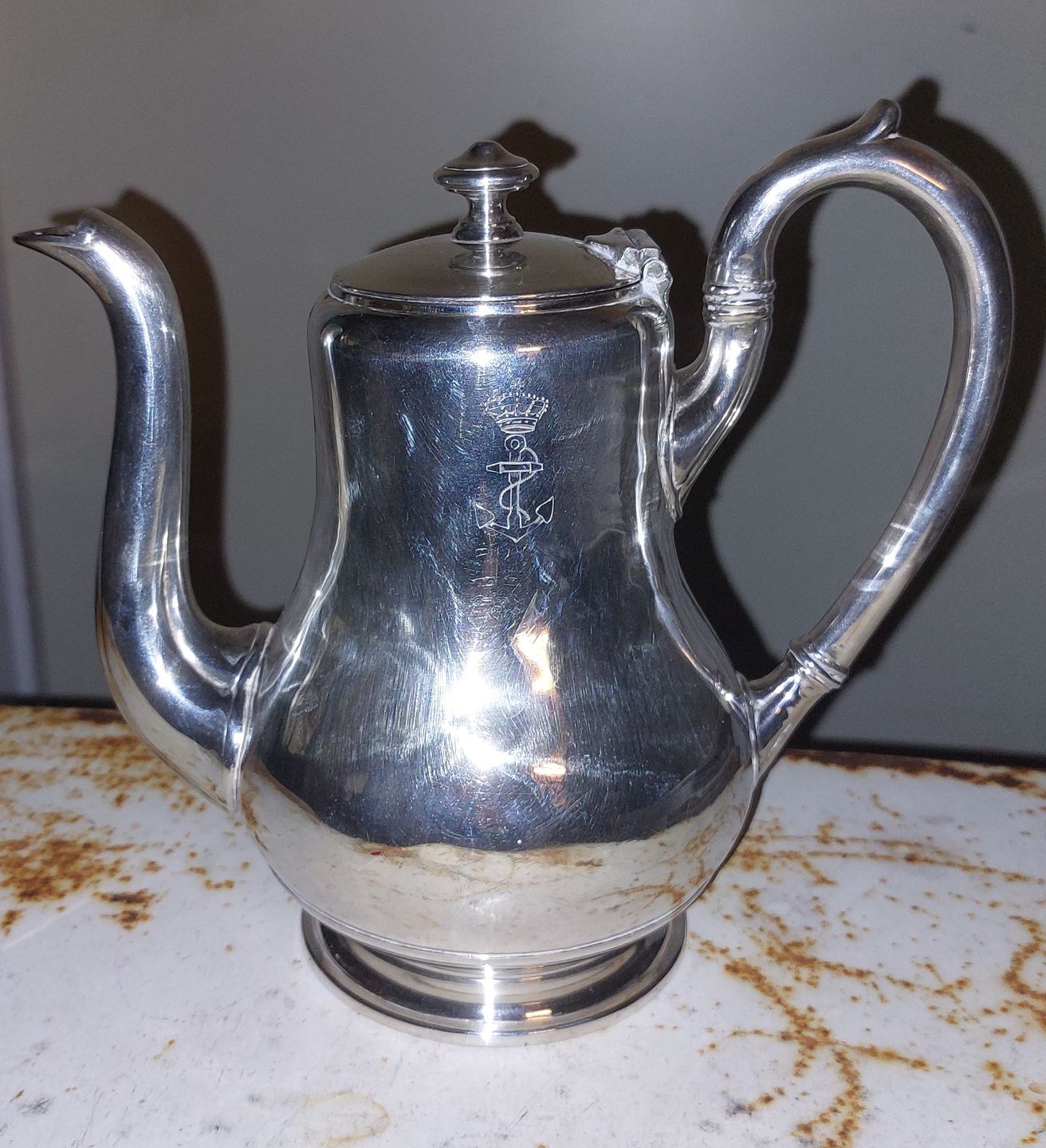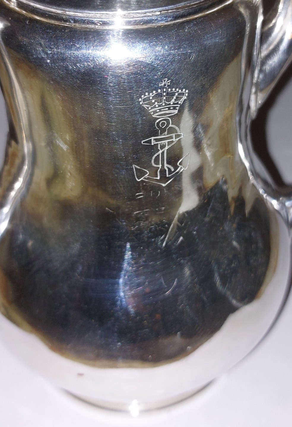 Kaffekander i sølvplet. På den ene side Søværnets logo (Danmark). Fremstår i god stand. H. 19 cm (7.48 inches) og 20½ cm lang (8.07 inches).
