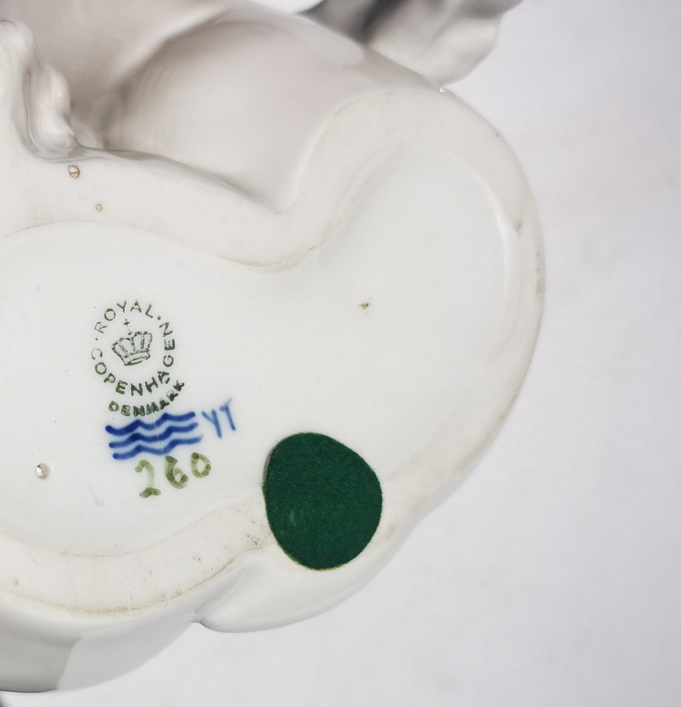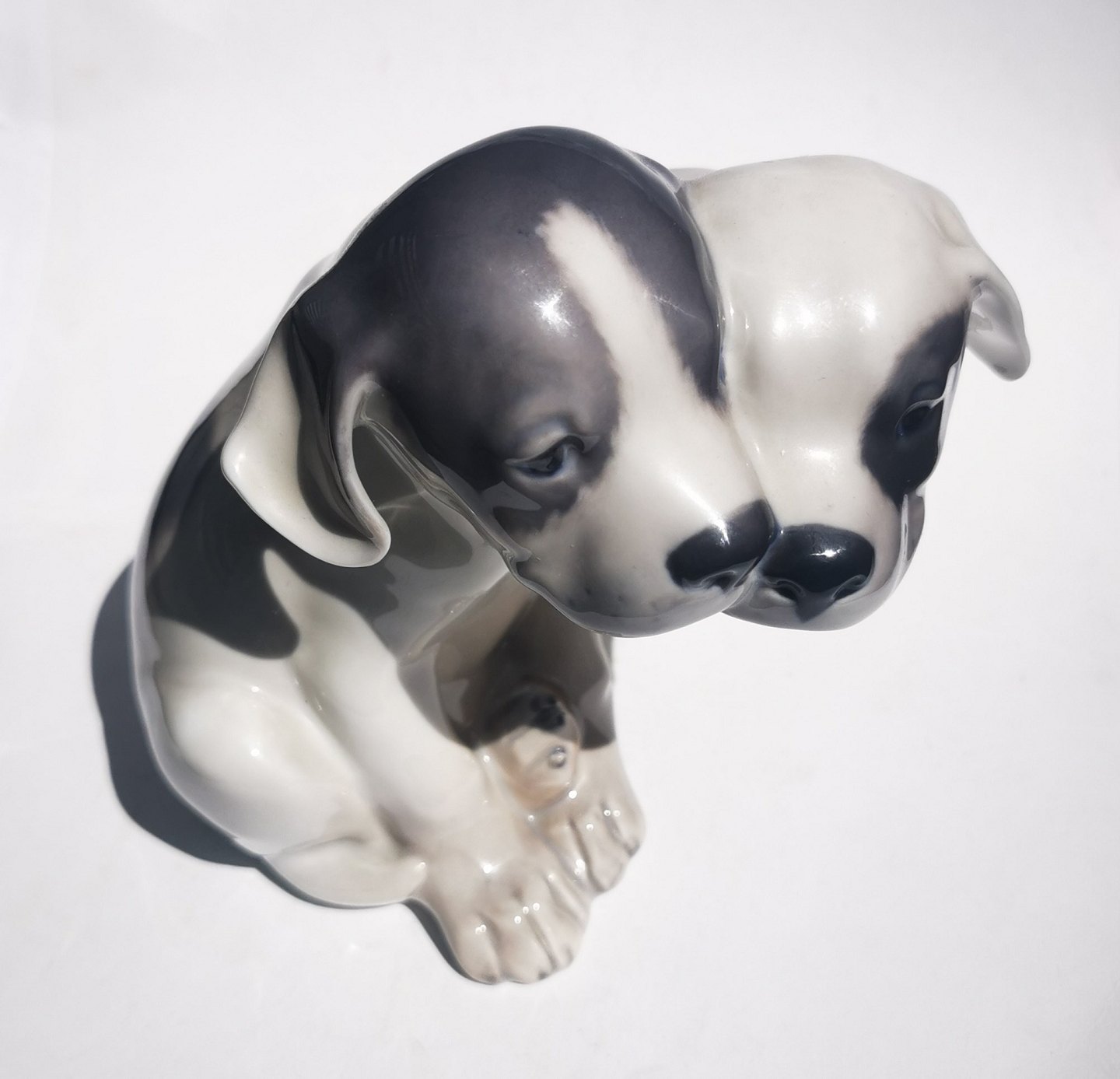 Figur i porcelæn fra Royal Copenhagen. Forestillende to pointer hvalpe. Designet af Erik Nielsen. I god stand. 1. sortering. Fabriksmærket på bunden. Modelnummer 260. Mål: 14½ cm høj (5,70 tommer)