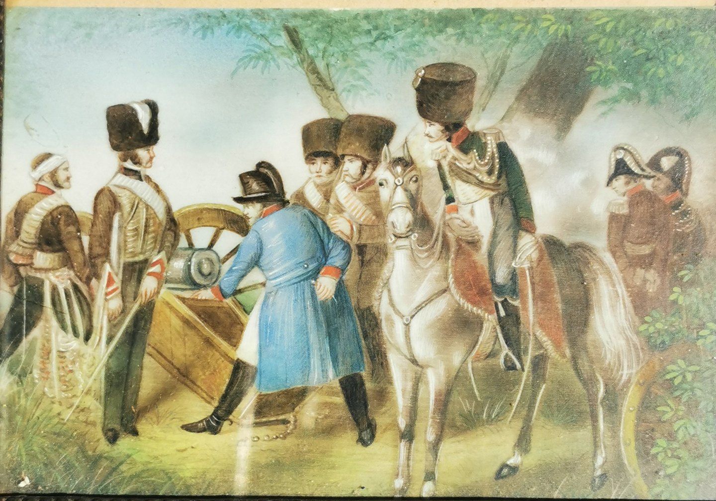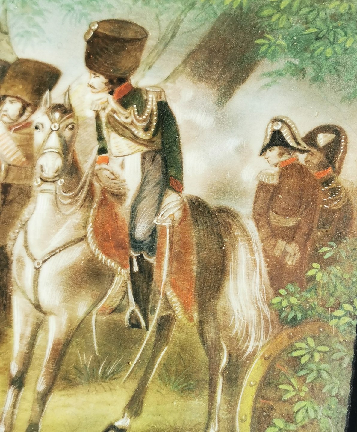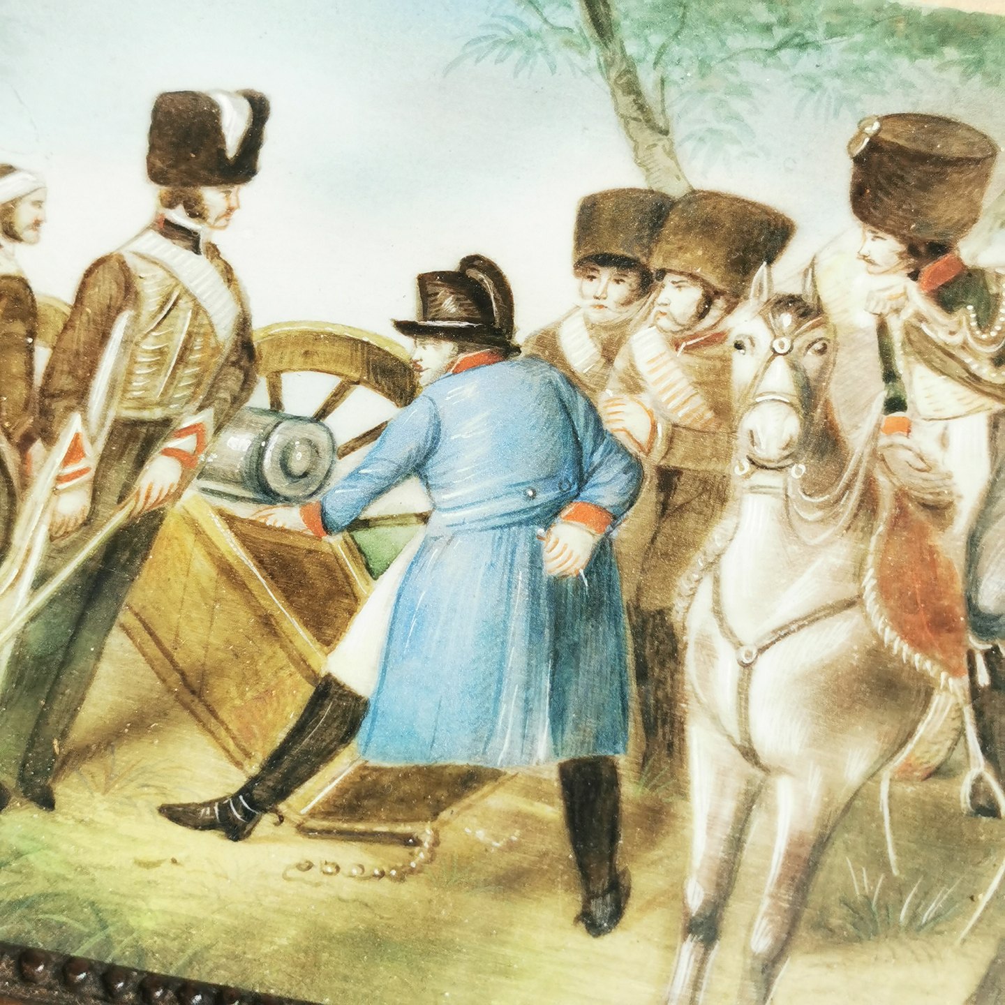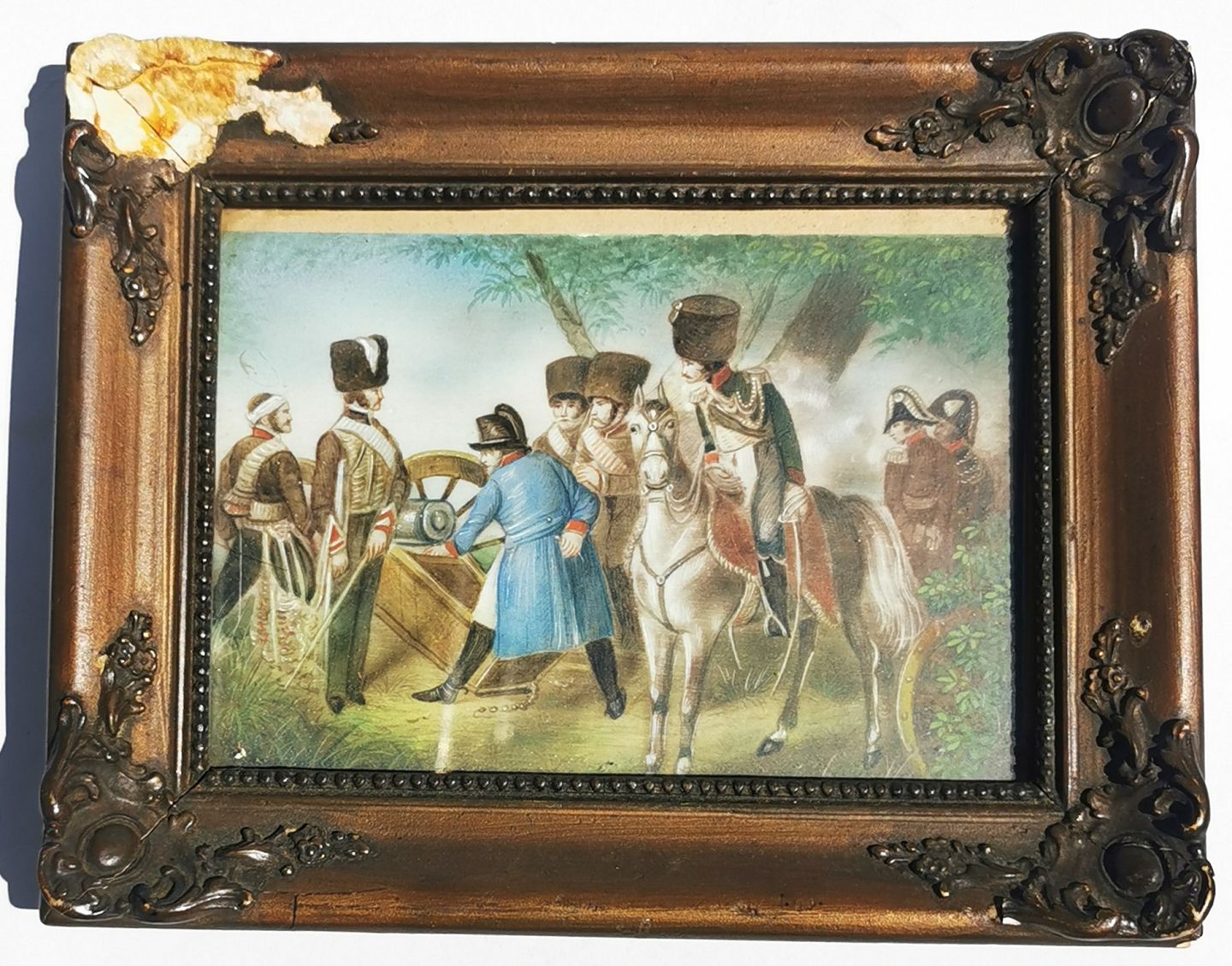 Miniature maleri med krigsscene: "Napoleon med sine officerer". Første halvdel af 20. århundrede. Rammen med defekt. Mål: 15 cm (5.90 tommer) x 18½ cm (7.28 tommer).