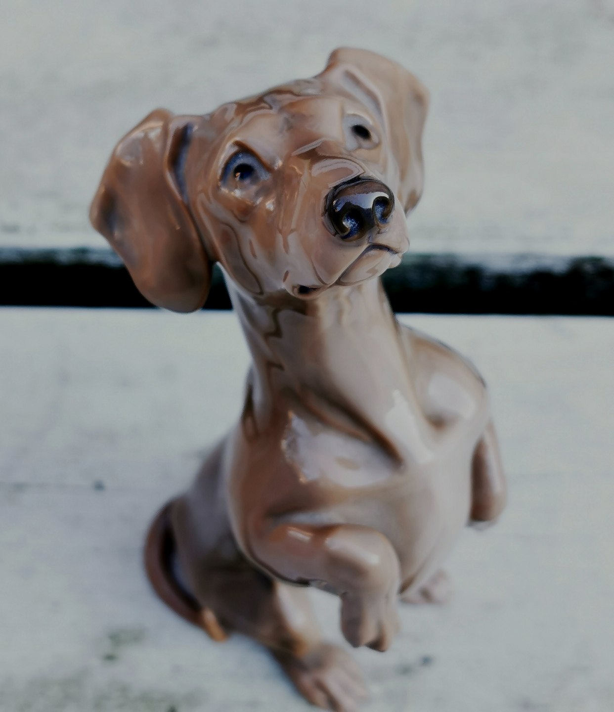 Figur i porcelæn af Dahl Jensen for Bing & Grøndahl: "Tiggende gravhund" stående på bagben. Fremstår i perfekt stand. 1. sortering. H. 19 cm. Fabriksmærket på bunden. Modelnummer 1603.