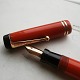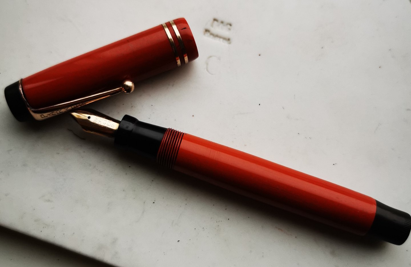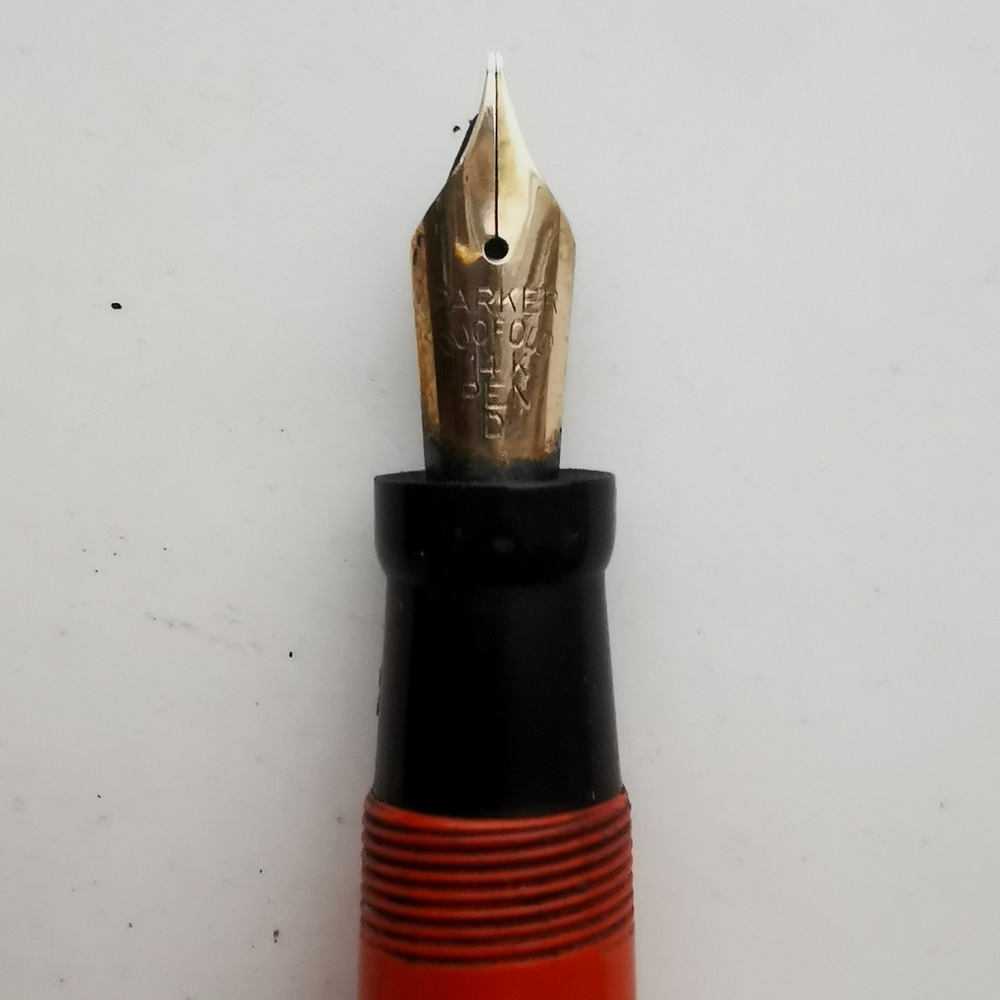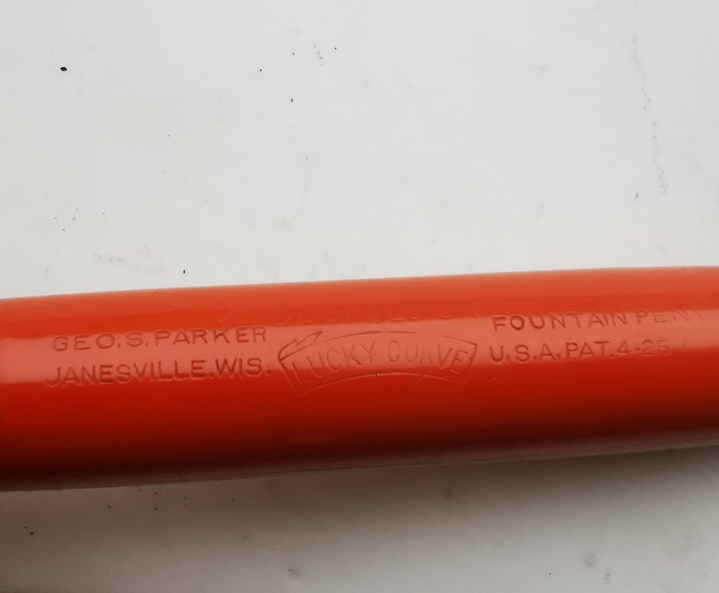 Kort koralrød Parker Lucky Curve Duofold Jr. fyldepen. Produceret omkring 1930. Push button filer. I den. Ende hvor spidsen sidder, er der en mindre defekt ved åbningen samt mindre hårrevne på "tråden", der hvor hætten skrues fast på kroppen. Fint fabriksmærke på kroppen. Alle dele er originale Parker inclusiv den flotte 14 karat guld spids. Fyldepennen fungerer ikke. Ved ekstra betaling på d.kr. 250,- indsættes ny gummisæk, så den igen bliver dunktionsduelig. Mål: L. 11,5 cm