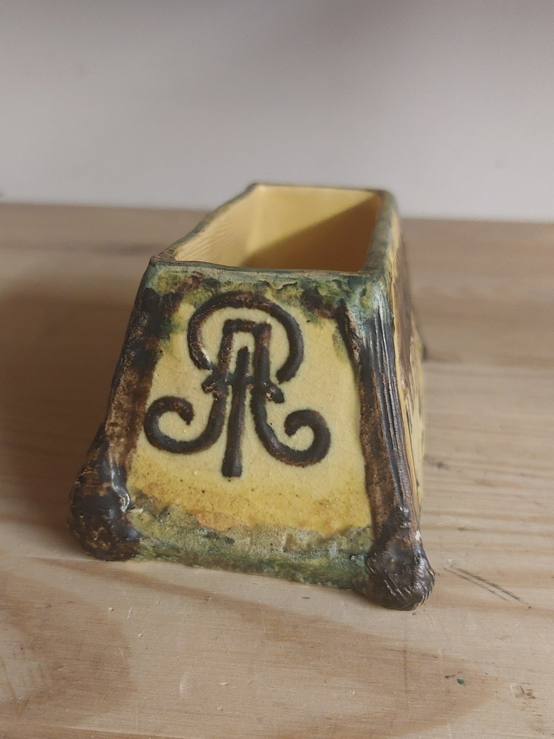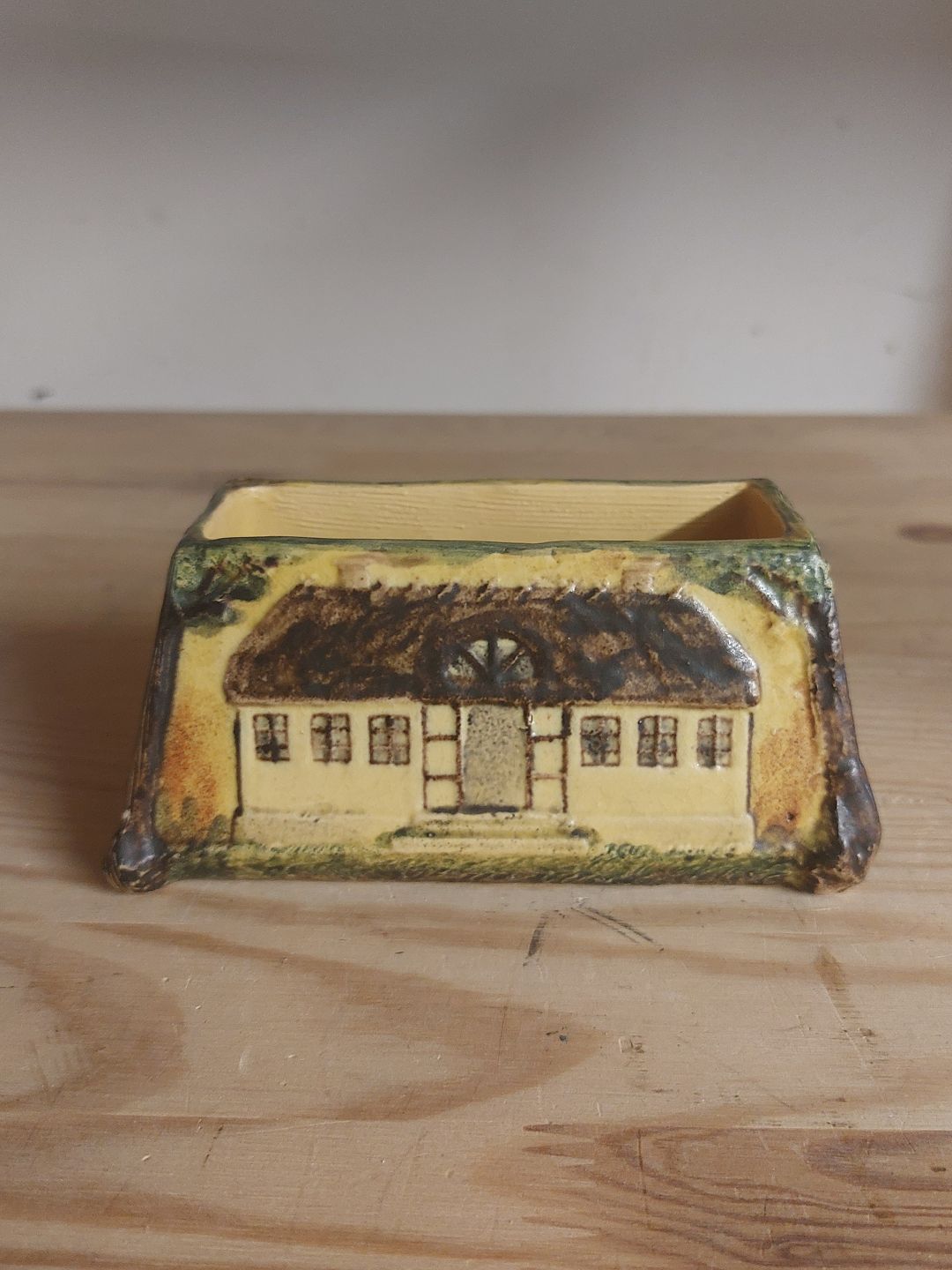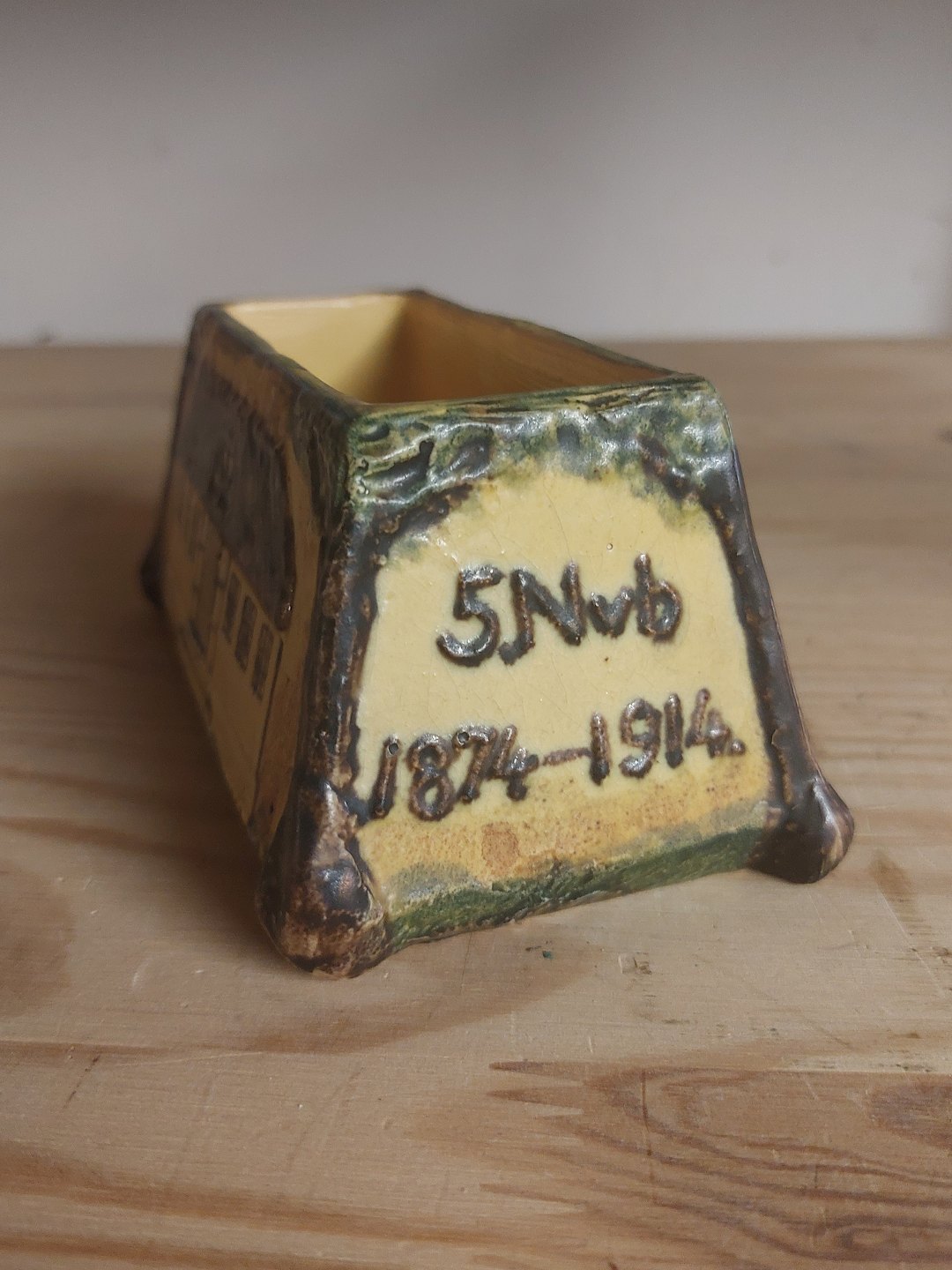 Skål I keramik fra den københavnske lervarefabrik Peter Ipsen. Dekoreret med to huse, 5. November. 1874-1914 samt monogram. Årsag/anledning til fremstilling af denne skål kendes ikke. Har et meget lille glasurafslag (se foto). Fabriksmærket på bunden med P. Ipsen. Mål: H. 6,2 cm, L. 13,4.cm og 7,5 cm dyb.