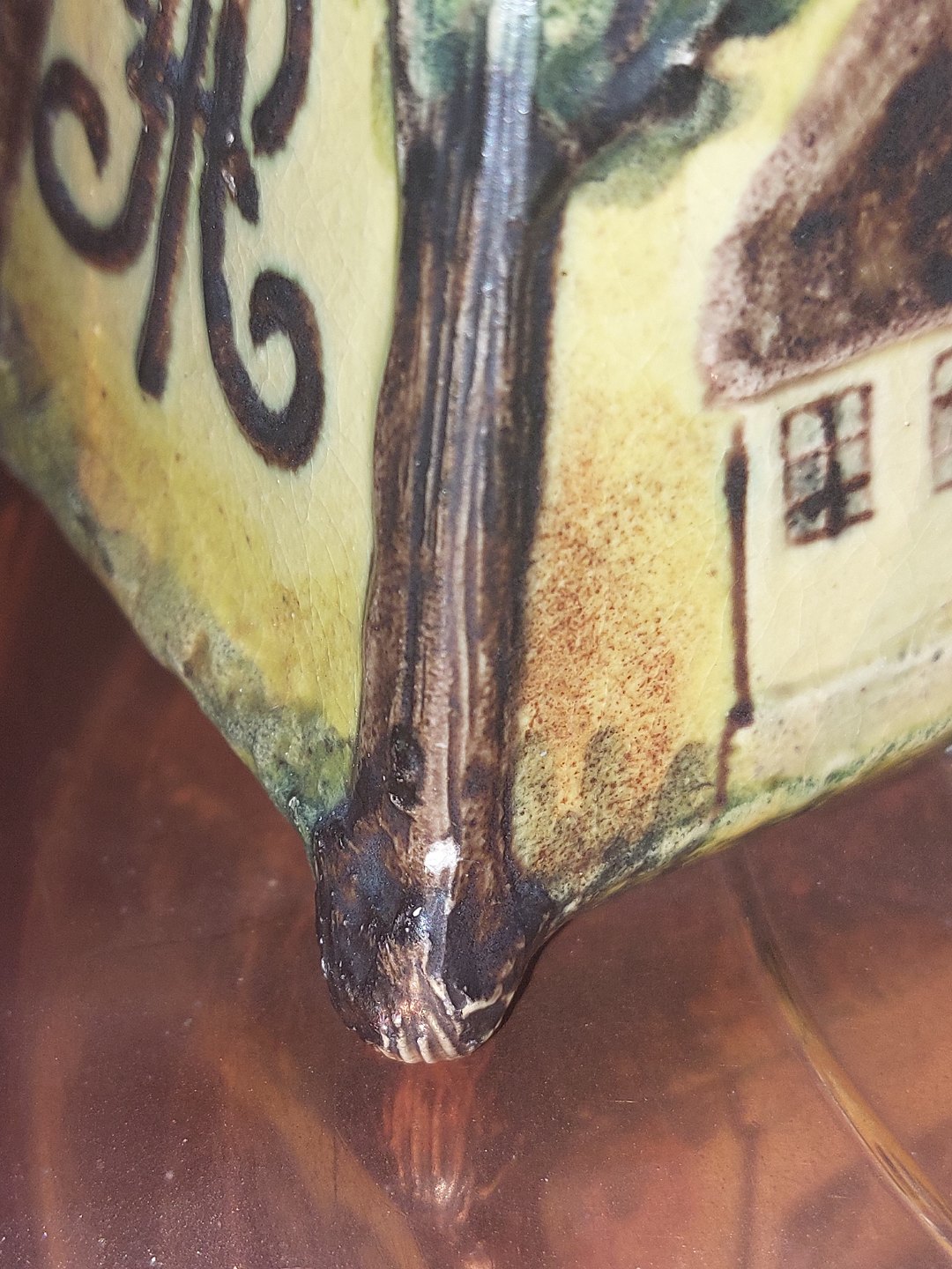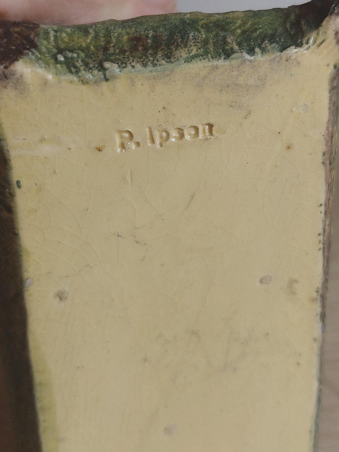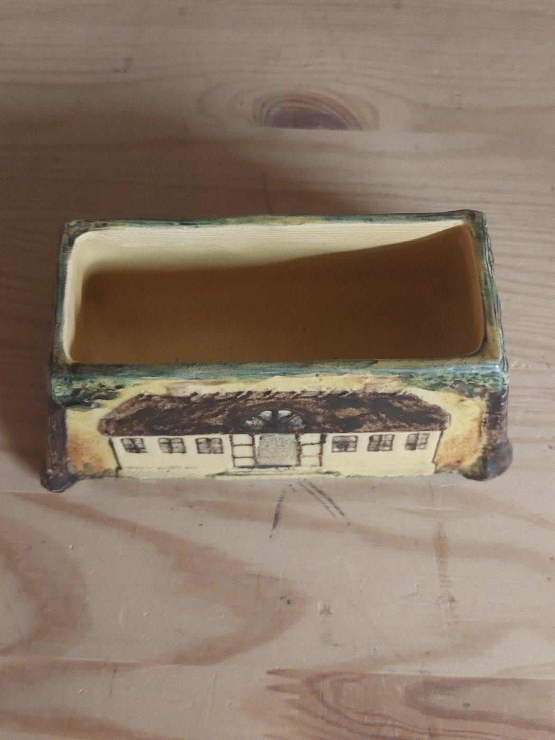 Skål I keramik fra den københavnske lervarefabrik Peter Ipsen. Dekoreret med to huse, 5. November. 1874-1914 samt monogram. Årsag/anledning til fremstilling af denne skål kendes ikke. Har et meget lille glasurafslag (se foto). Fabriksmærket på bunden med P. Ipsen. Mål: H. 6,2 cm, L. 13,4.cm og 7,5 cm dyb.