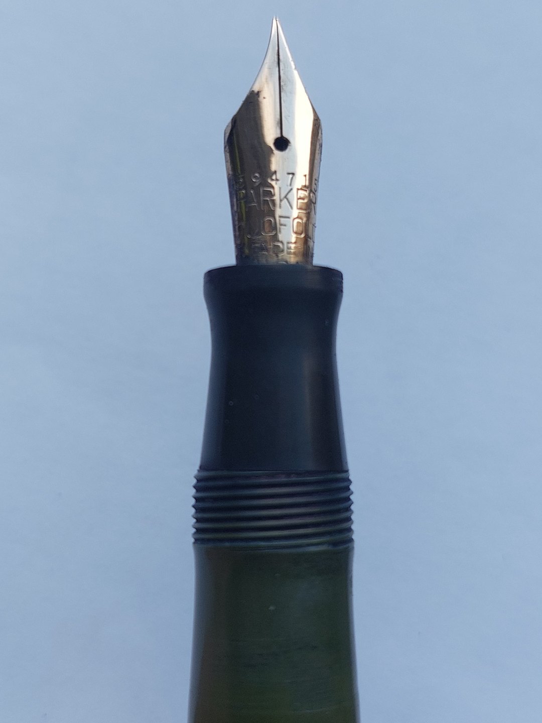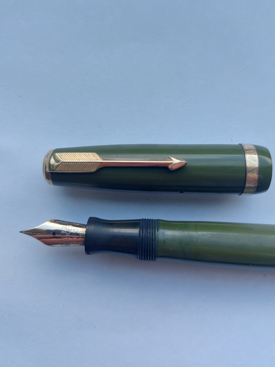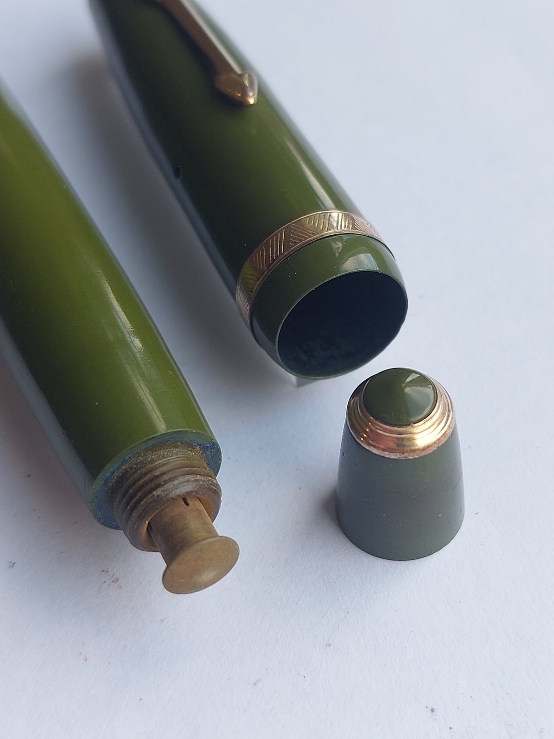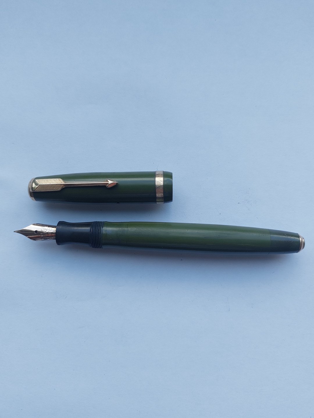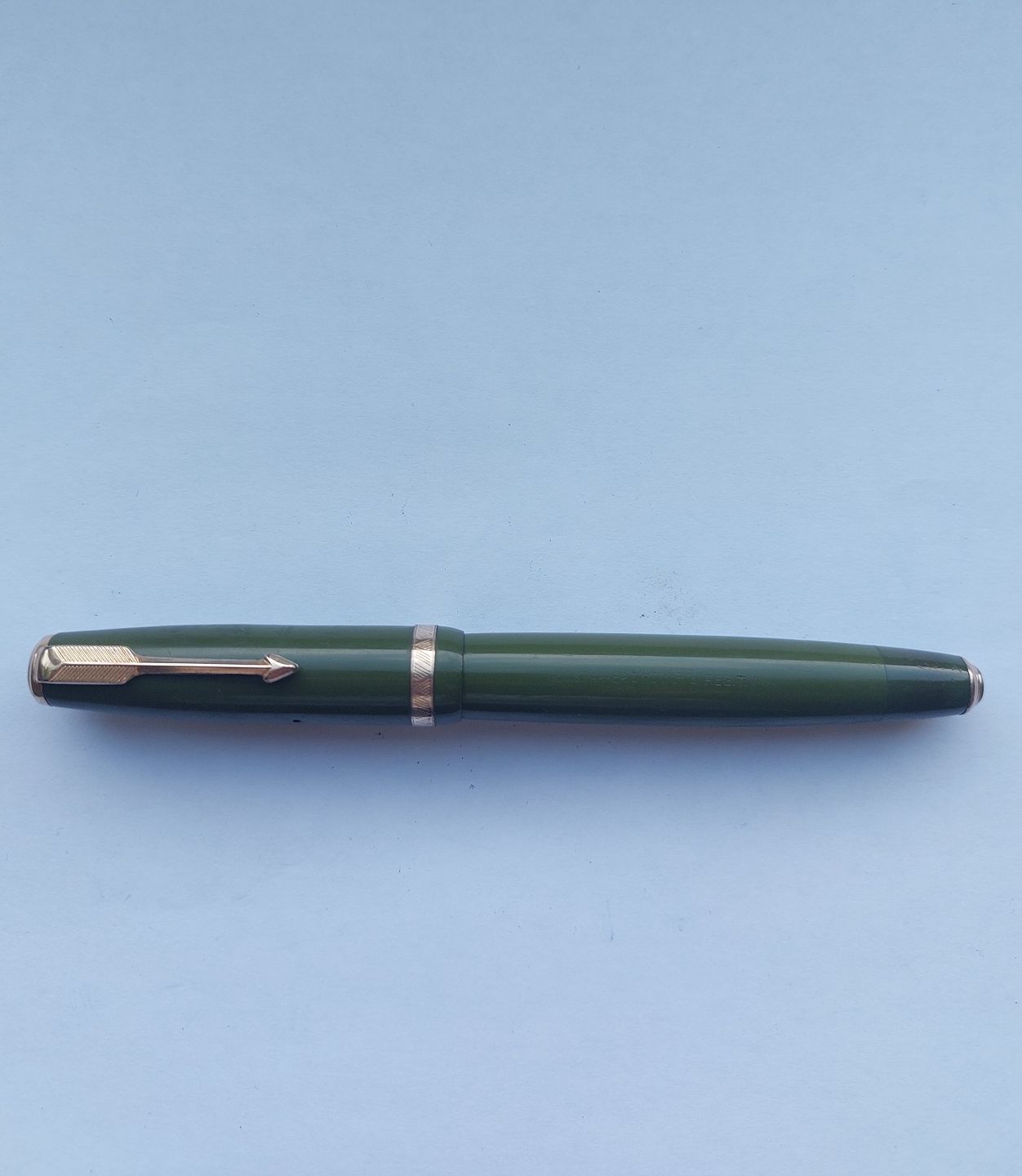 liven grøn Parker Duofold fyldepen fra 1950´erne. Fremstillet i U.S.A. Fremstår i god stand. Ingen skader eller reparationer. L. 13,5 cm