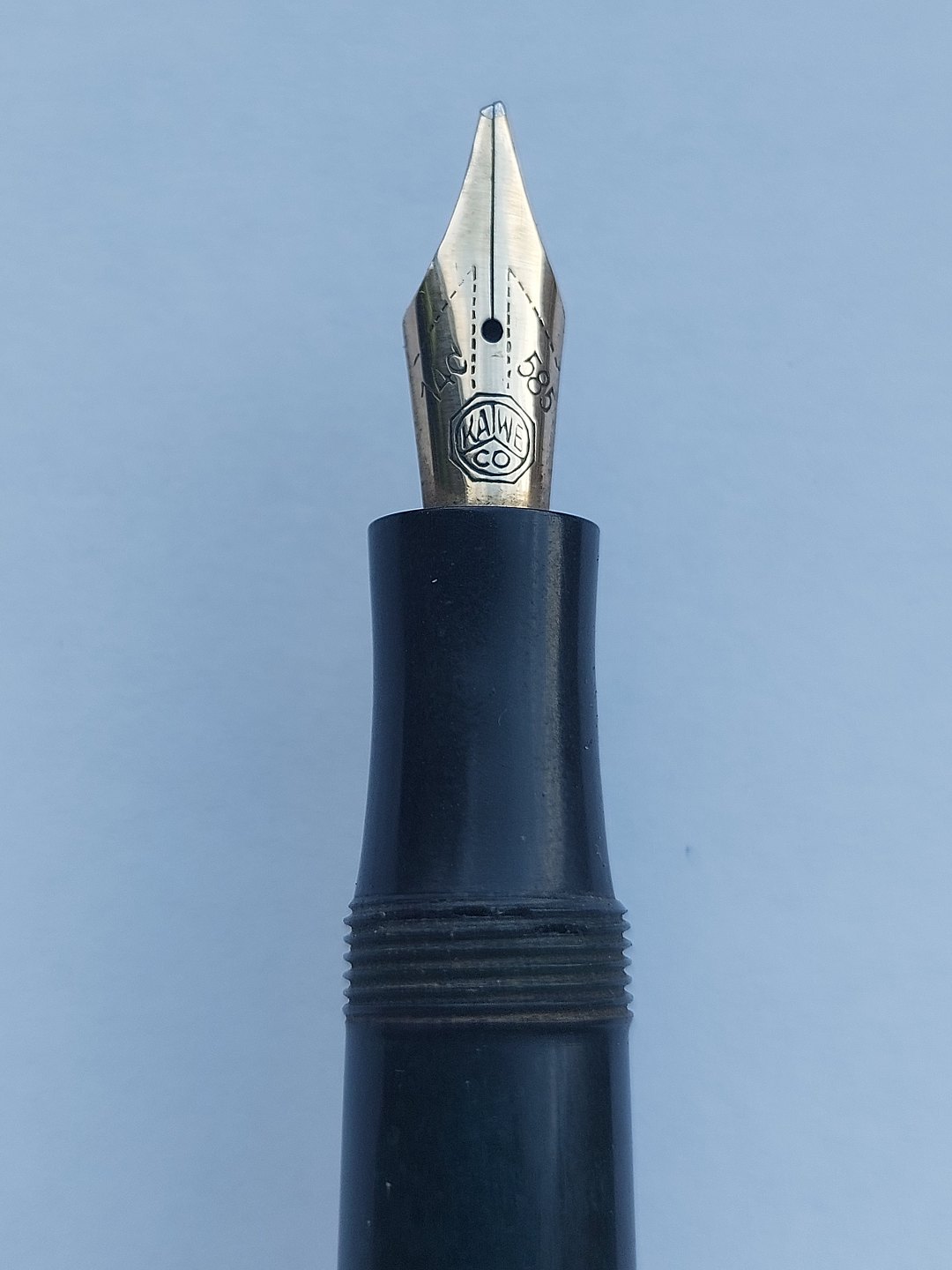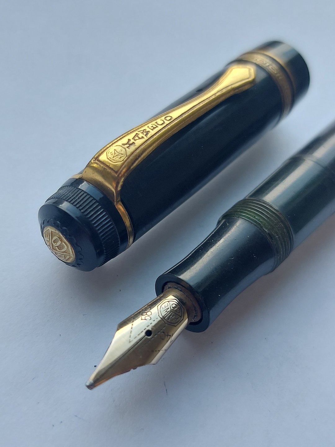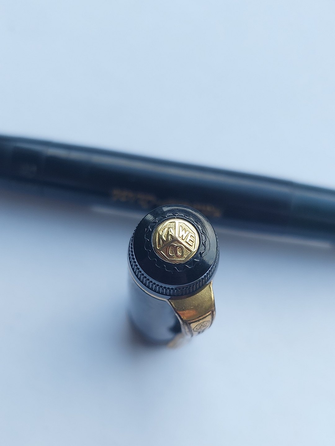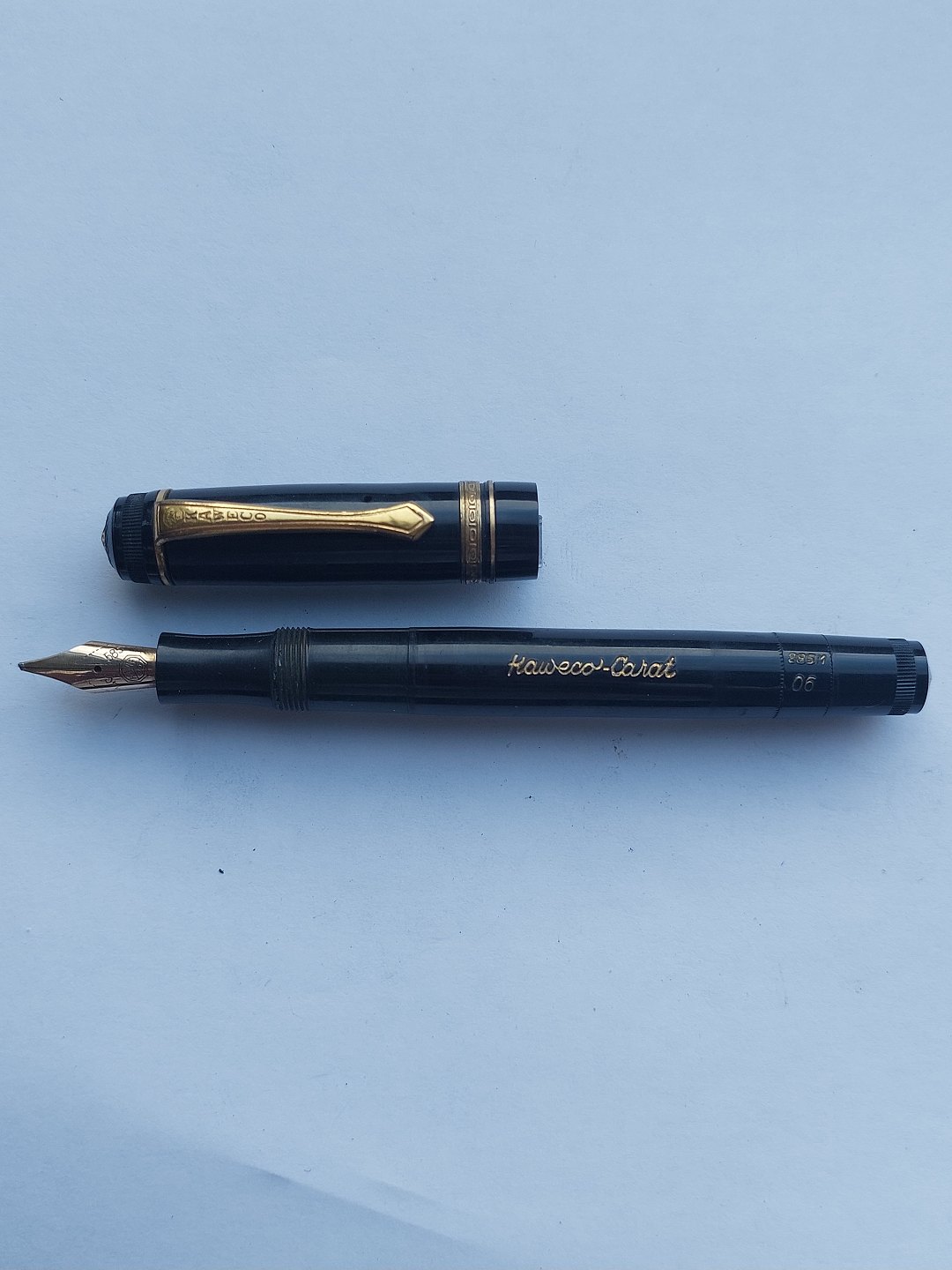 Sort Kaweco - Carat fyldepen modelnummer 885/1 06. Piston filler. Alle dele originale inclusive 14 karat 585 guldspids. Fremstillet i Tyskland. Fremstår i usædvanlig god stand uden skader eller reparationer. Fyldepennen er 12½ cm lang (4.92 tommer).