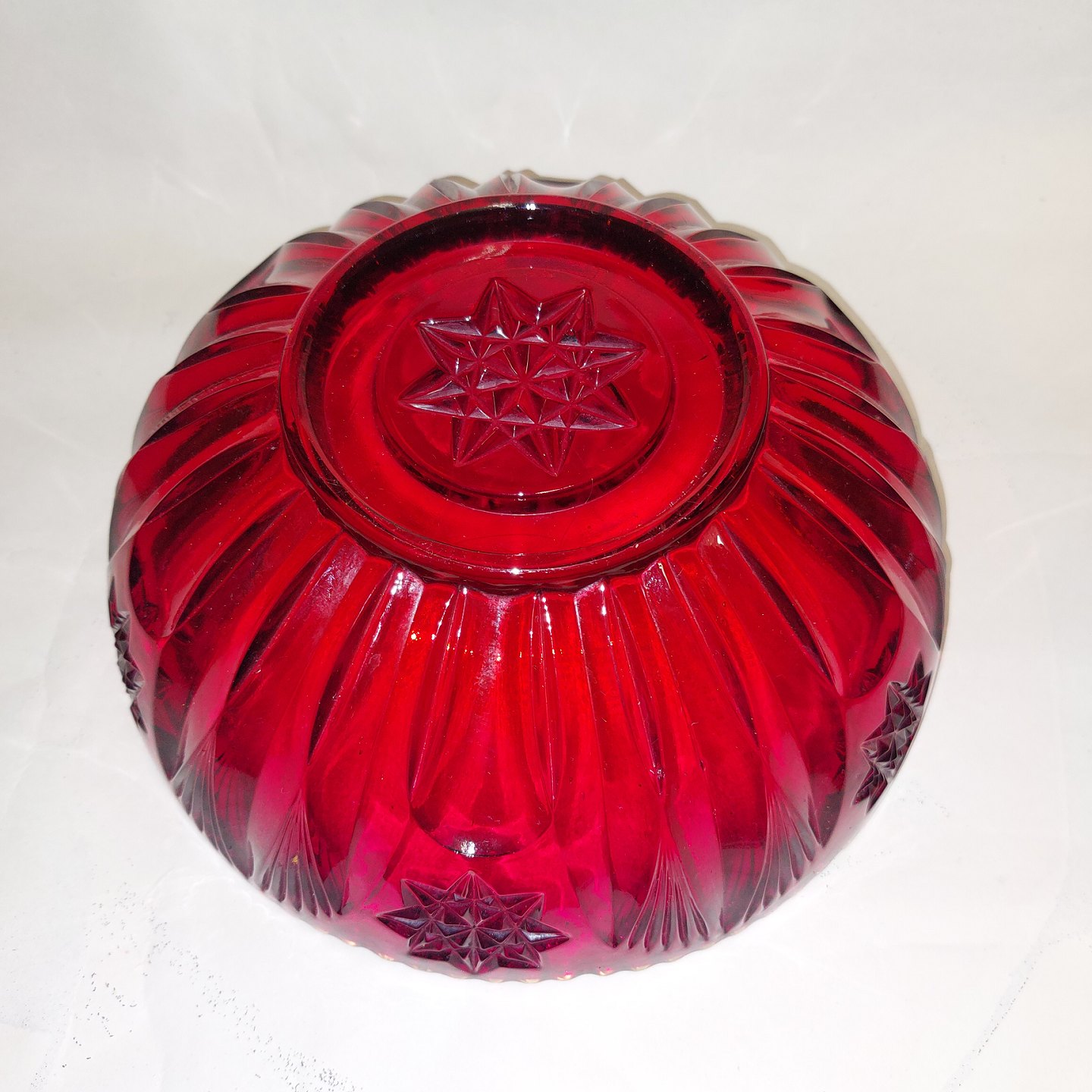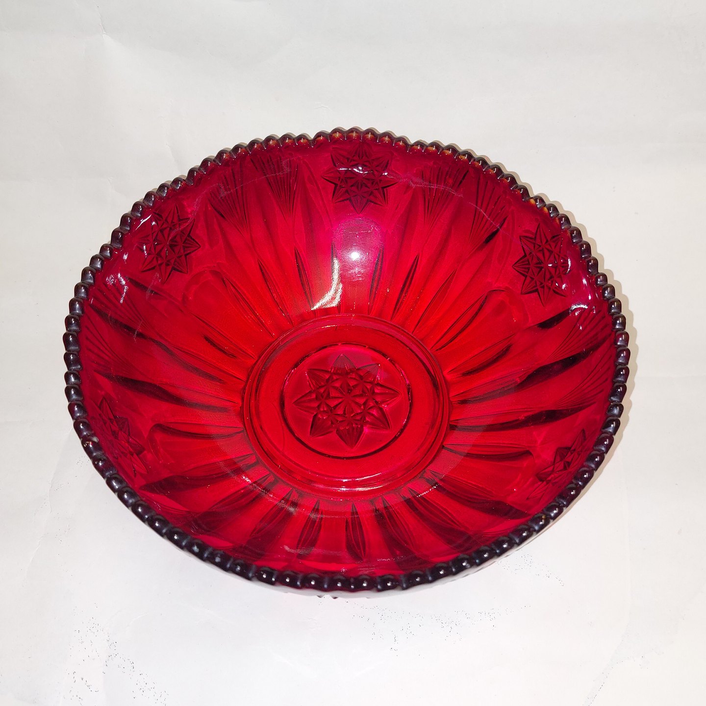 Stor rød skål I presset glas. Fremstillet omkring 1930. I god stand uden skader eller reparationer. Mål: H. 8,5 cm Ø. 23 cm