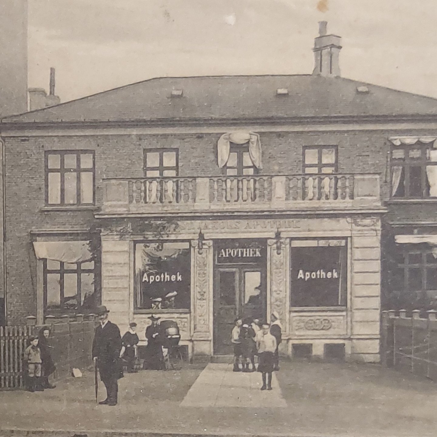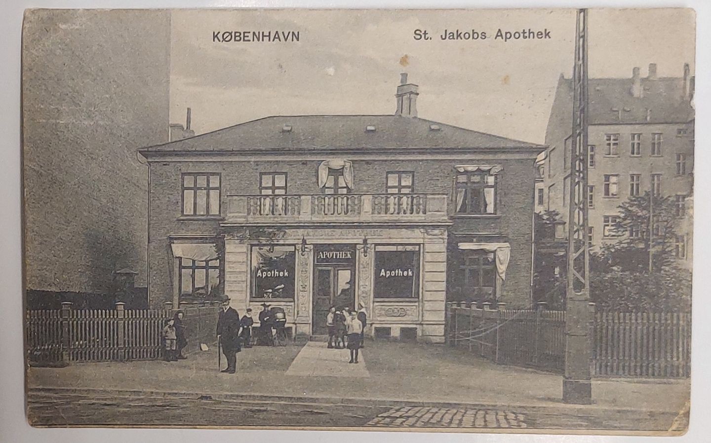 Postkort: Liv foran Sct. Jakobs Apotek i 1906
