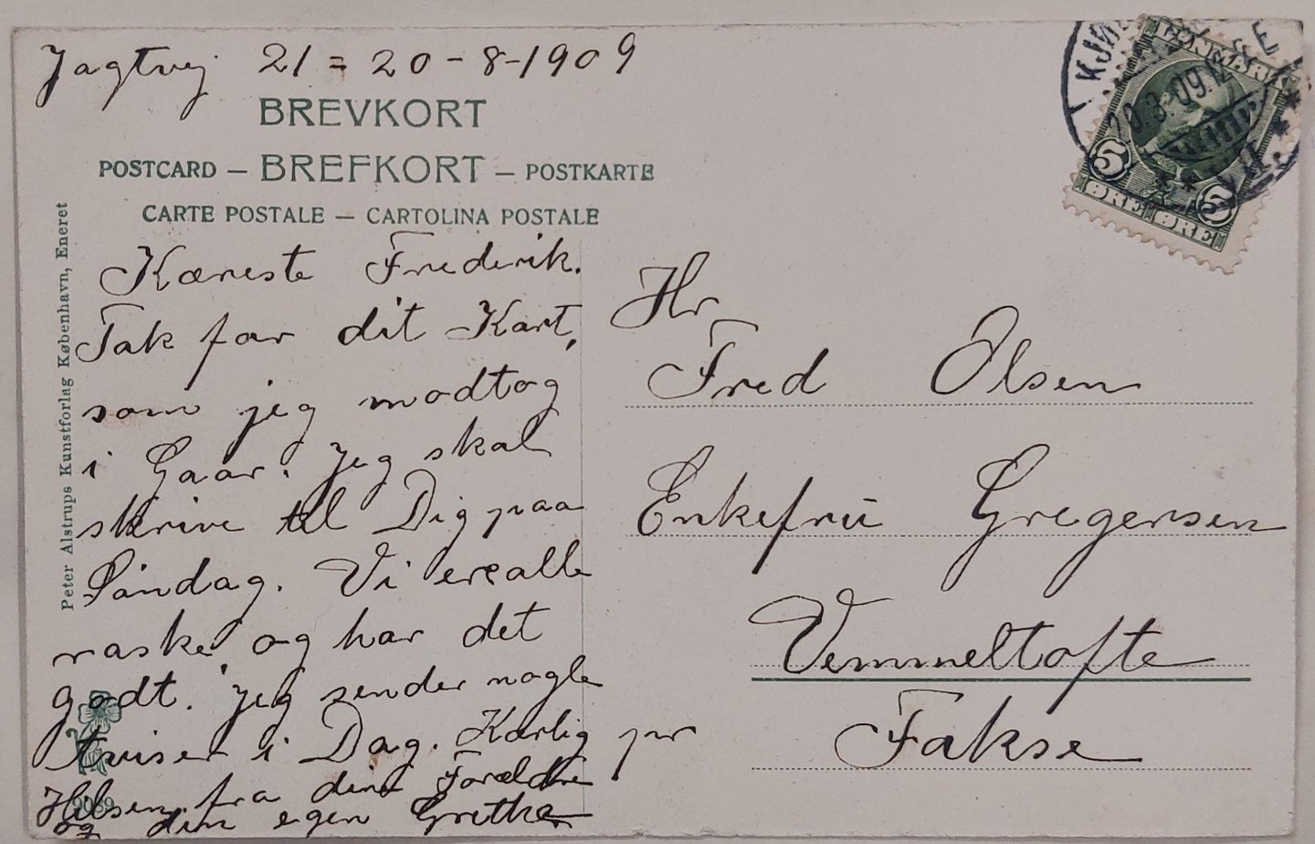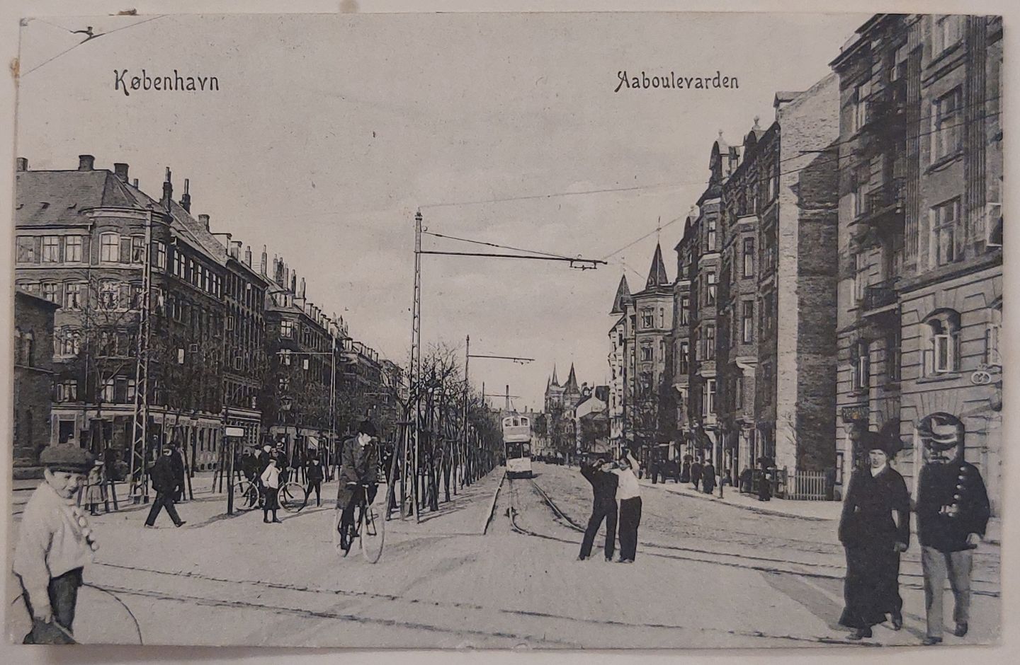 Postkort: Motiv med liv på Aaboulevarden. Annulleret KJØBENHAVN i 1909. I god stand.