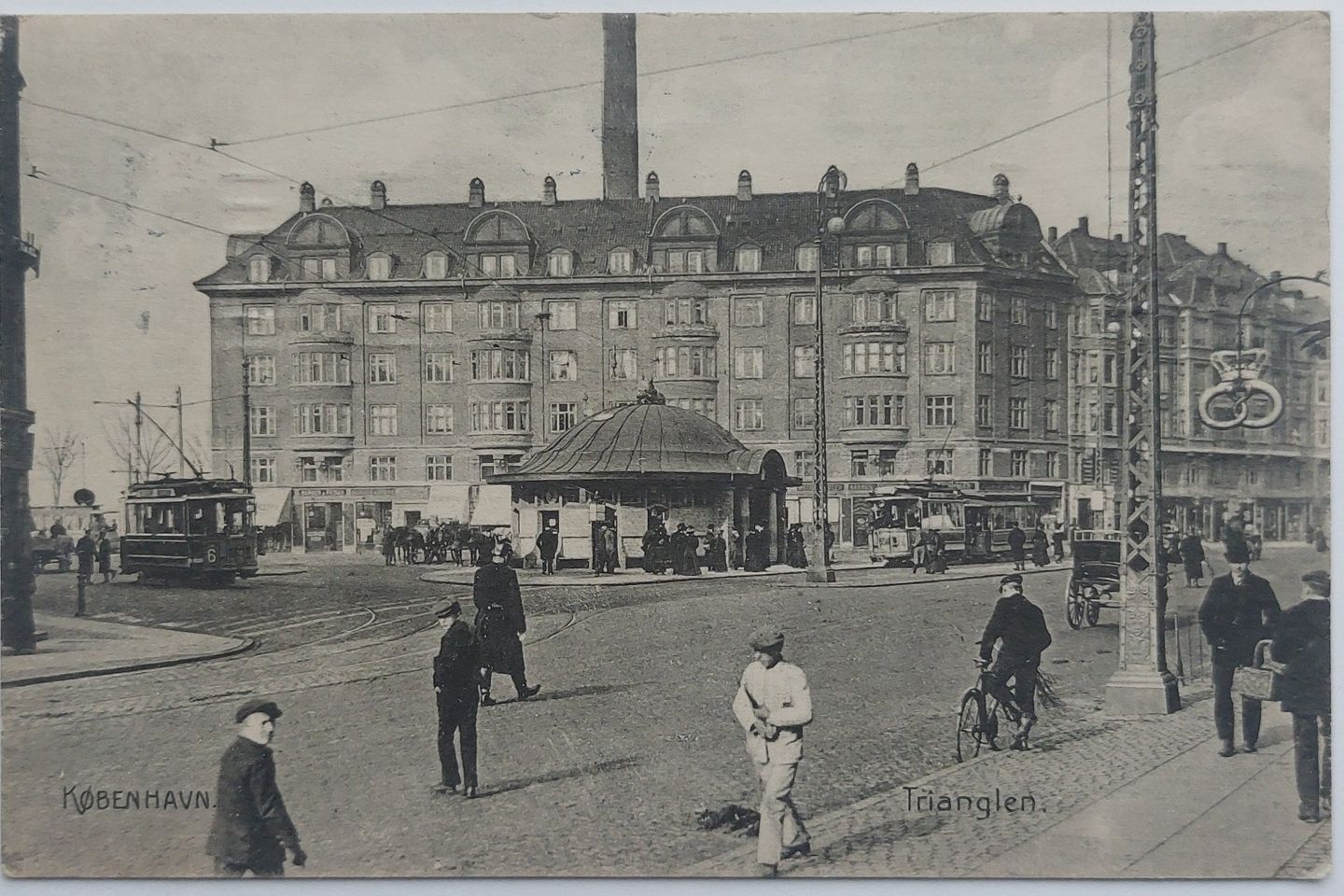 Postkort: Liv på Triangelen Østerbro. Annulleret i 1909. I god stand.
