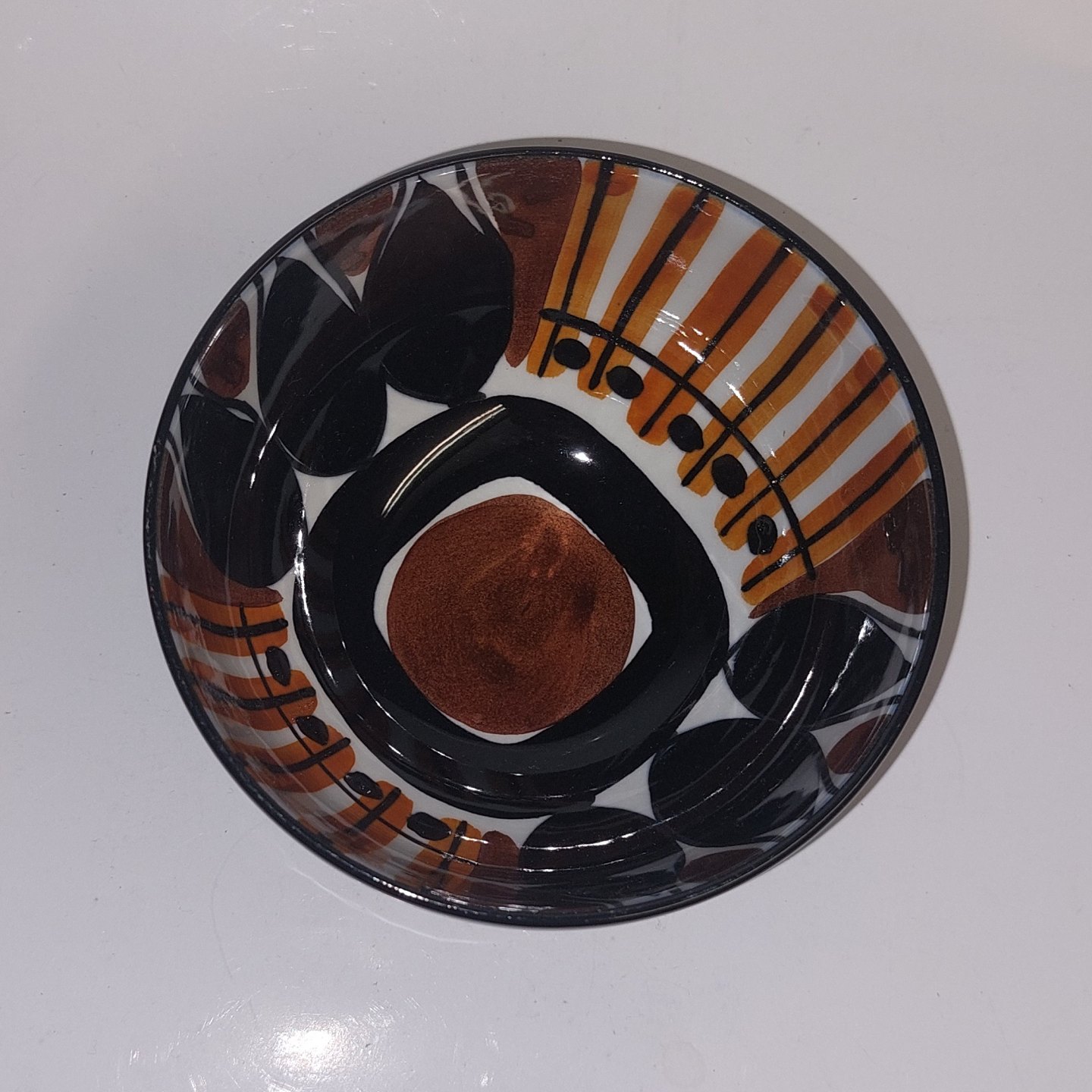 Skål i fajance fra Royal Copenhagen. Farverig dekoration indvendigt sort på ydersiden. Designet af Inge-Lise Kofoed. 1. sortering. I god stand uden skader eller reparationer. Fabriksmærket på bunden. Modelnummer 184 / 2186
