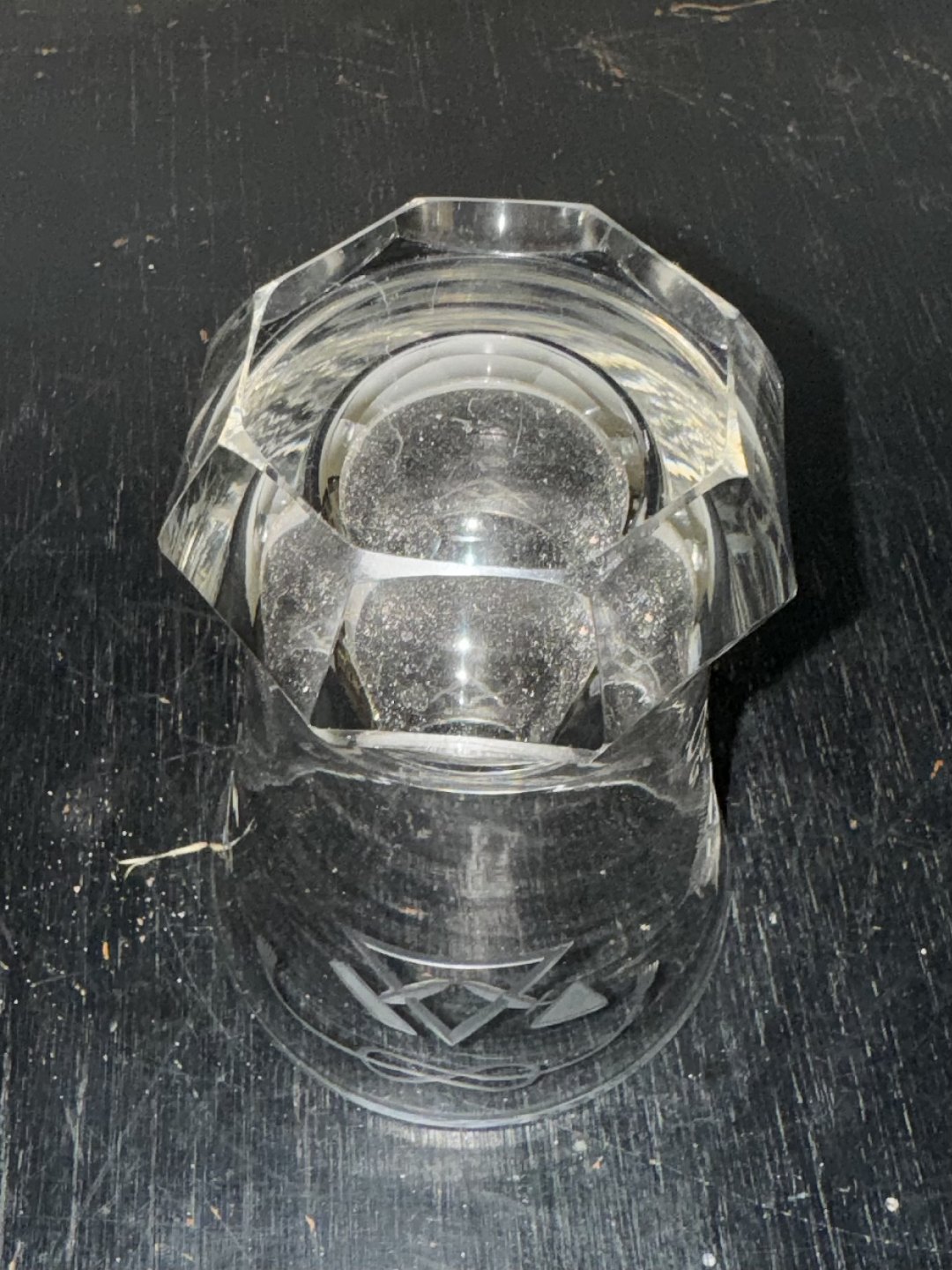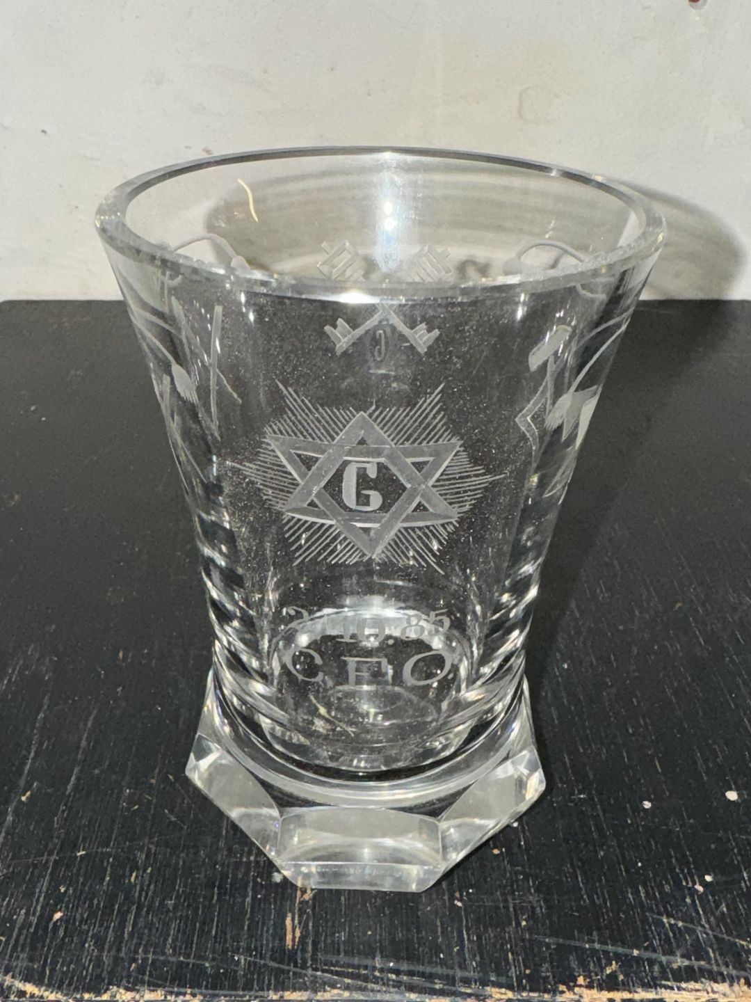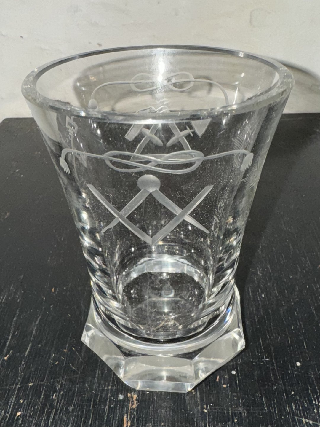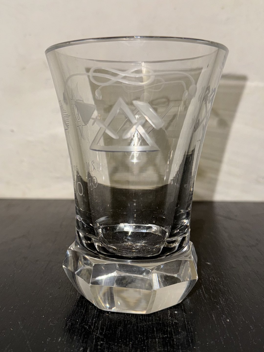 DANSK FRIMURER GLAS: Kraftigt glas med tung fod og graverede frimurer symboler. i god stand. H. 13,8 cm Ø. 9,5 cm