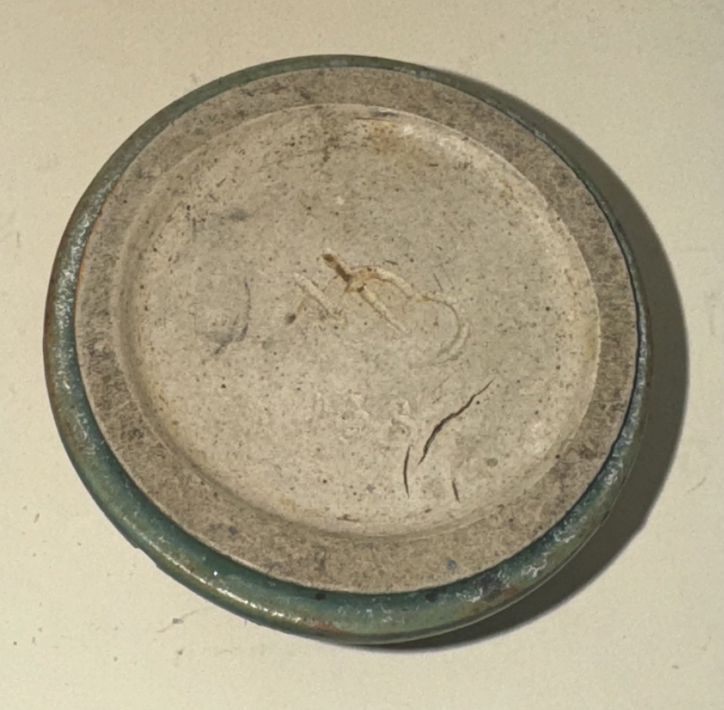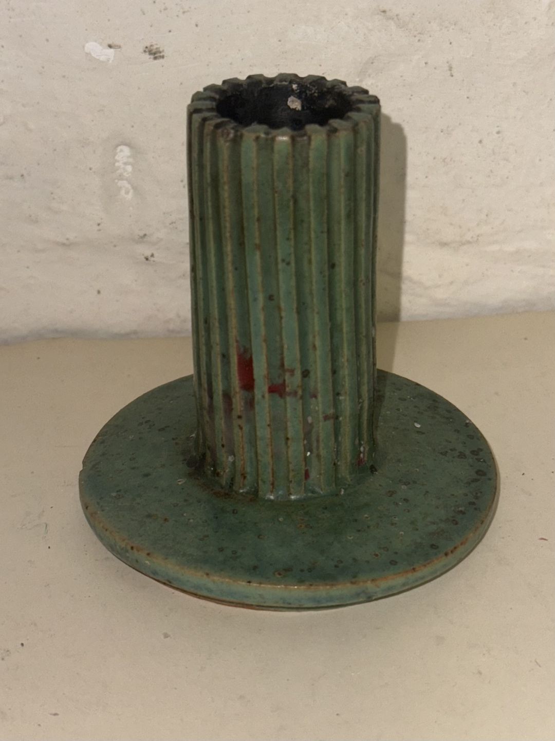Ceramic candlestick with grooved candle tube. In good condition. Covered in green glaze. Signs of wear inside. Inscribed AB on the underside along with model number 133. H. 9.2 cm