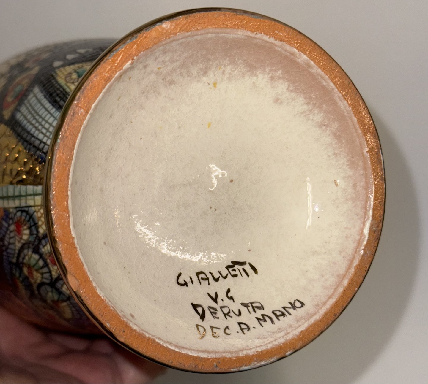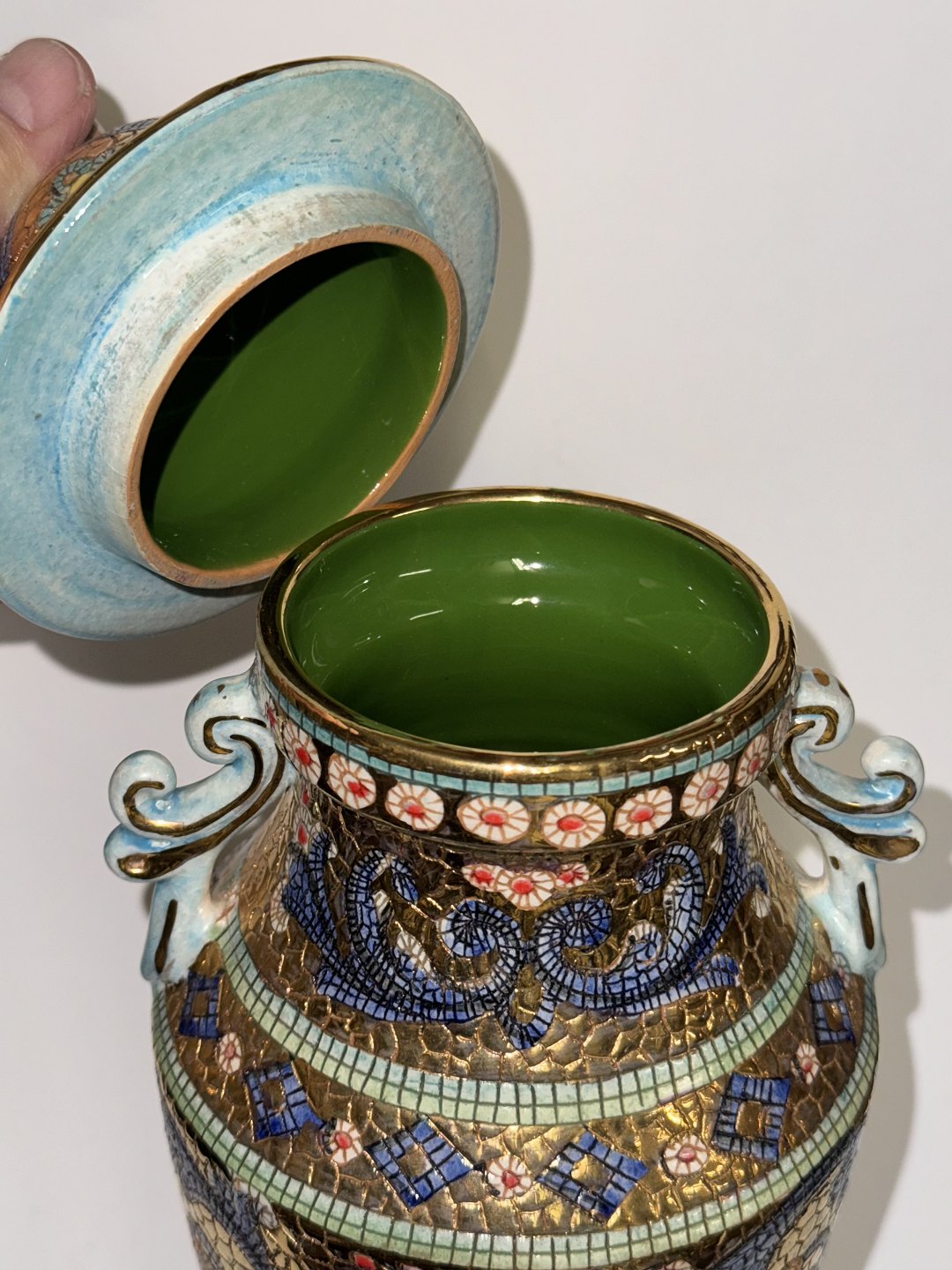 Deruta mosaik krukke med hanke og låg i majolika fremstillet i Umbrien i Italien. Motiv med afbildning af kejserinde Theodora, kejser Justinians byzantinske hustru fra det sjette århundrede, senere kanoniseret af den østlige ortodokse kirke som Saint Theodora. På bagsiden motiv med påfugl. Mosaik-designet er indgraveret med hånden, direkte på vasen, i stedet for små påsatte stykker. Emnet har et meget farvestærkt udtryk med metallisk overflade. Fremstår i god stand. Fabrikamærket på bunden. H. 33,5 cm inklusiv låg.