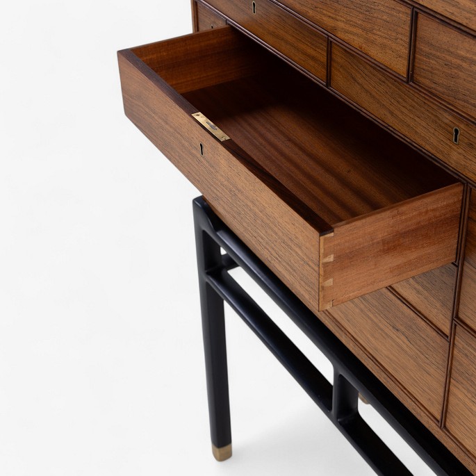 Sjældent skab i palisander med skuffer og sortlakeret stel med messingsko.