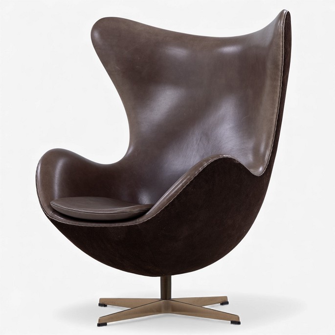 AJ 3316 - 'The Egg' armchair with stool in original dark brown Elegance leather and brown suede on a bronze frame. Anniversary model from 2008. Number 489/999.