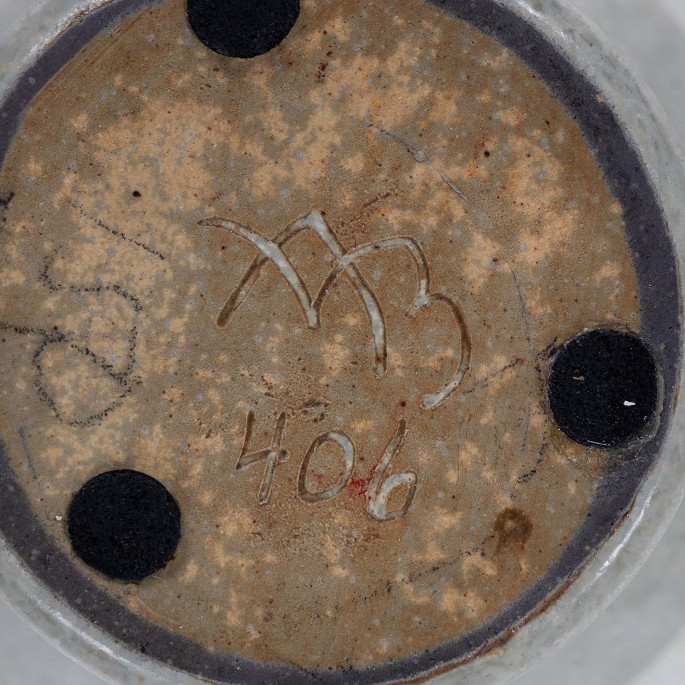 AB 406 - Lav lysestage i stentøj med lys glasur. Signeret.