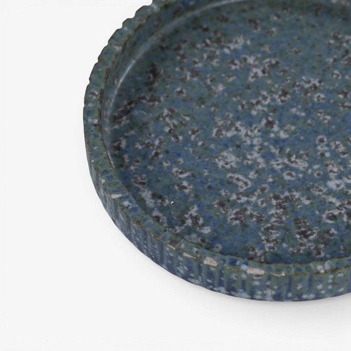 Rundt fad i riflet stentøj med blågrøn glasur. Signeret.
