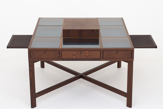 Smykkedisk i wengé udført i otte skuffesektioner m. glasoverflader og blåt bomuldsunderlag, der er derudover to udtræksplader m. brun læderbelægning. Disken er lavet til Georg Jensen i starten af 1980'erne.