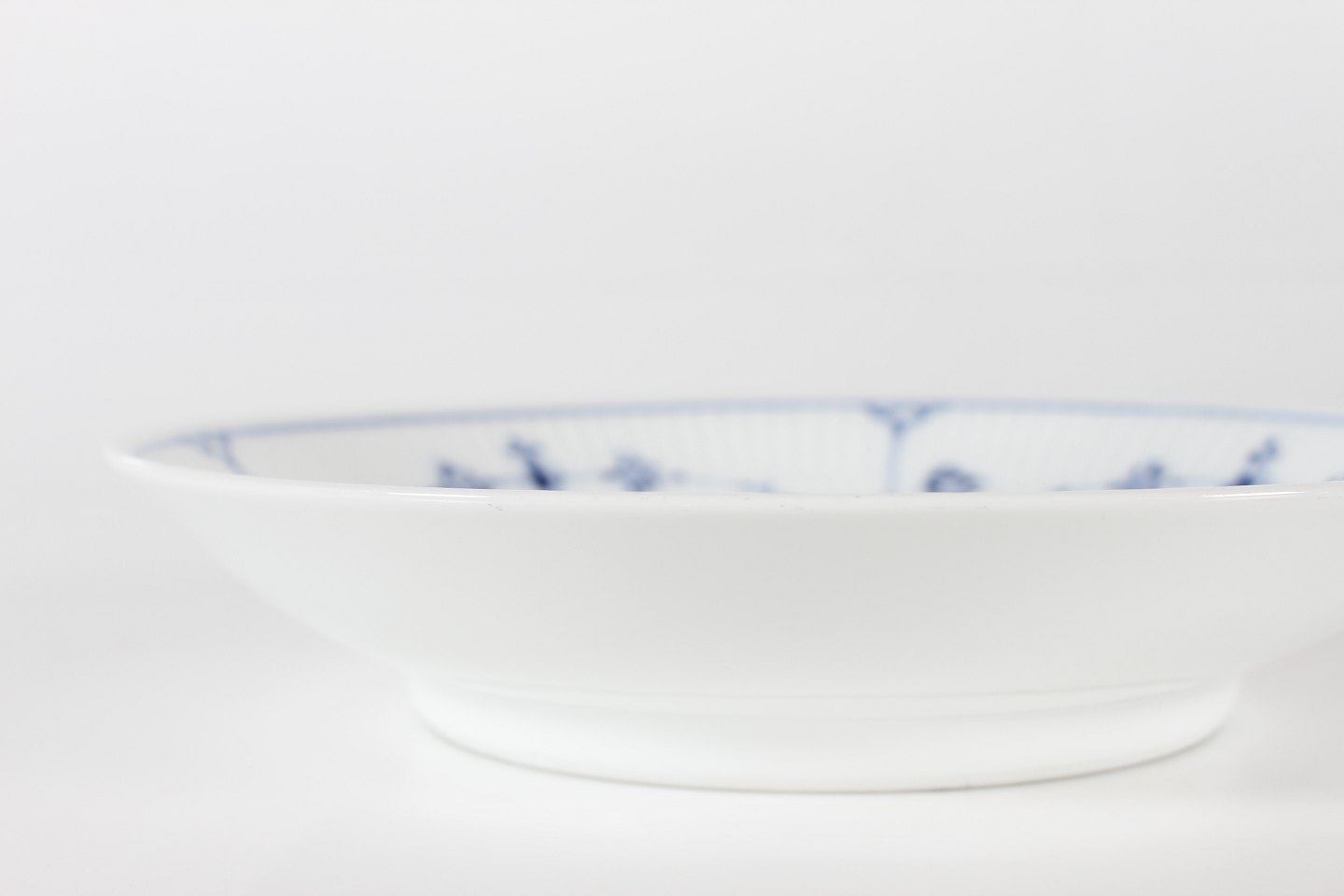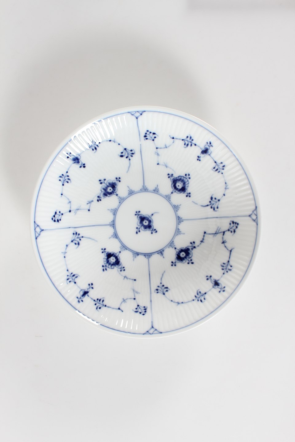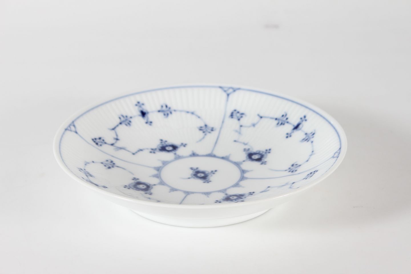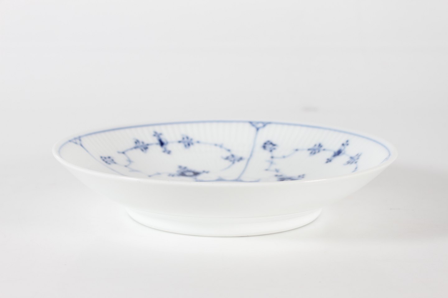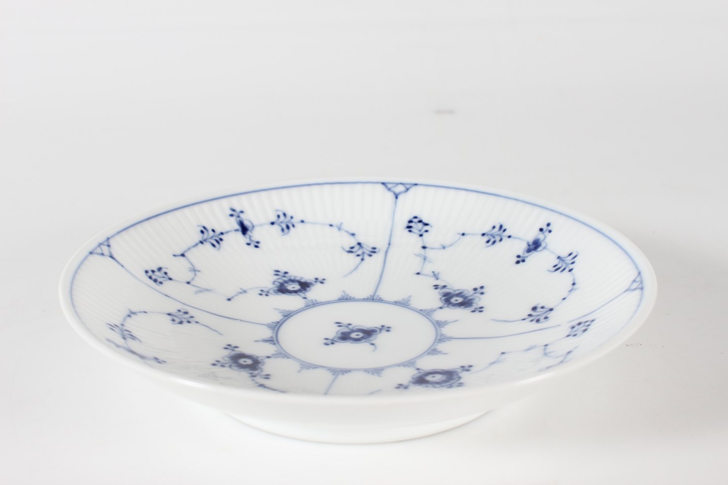 Royal Copenhagen Musselmalet Riflet Lav rund skål eller dybt fad model 1/10 Med stempel fra perioden 1923-34 Diameter 24,5 cm Højde 5 cm Fin fejlfri 1. sortering