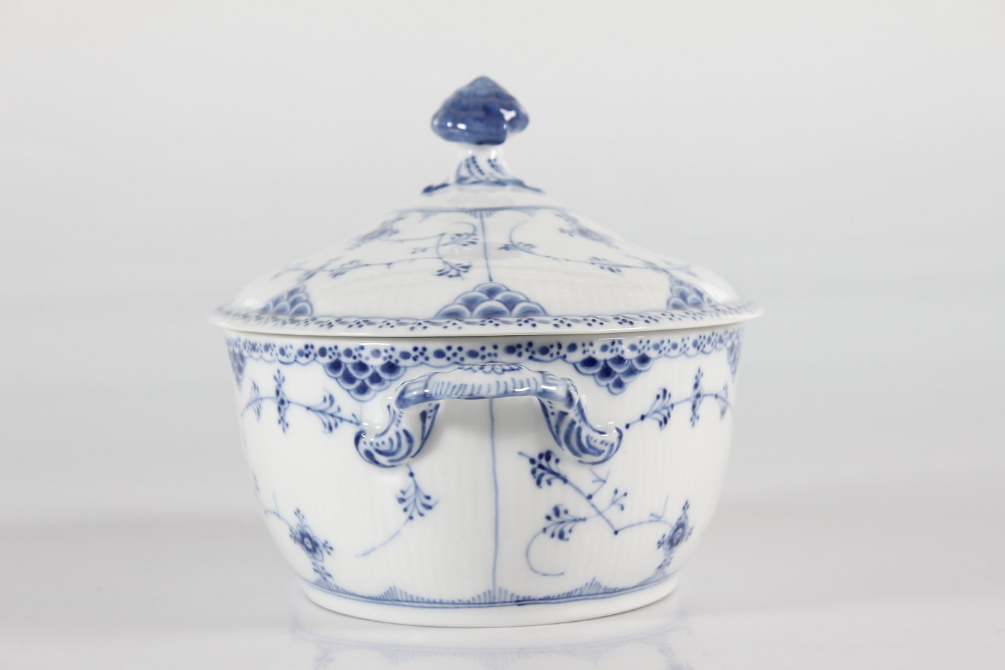 Royal Copenhagen Musselmalet Halvblonde Stor oval terrin nr. 1/595 Med stempel fra perioden 1923-34 Længde 32 cm Bredde 21 cm Højde 20 cm Fejlfri 1.sortering