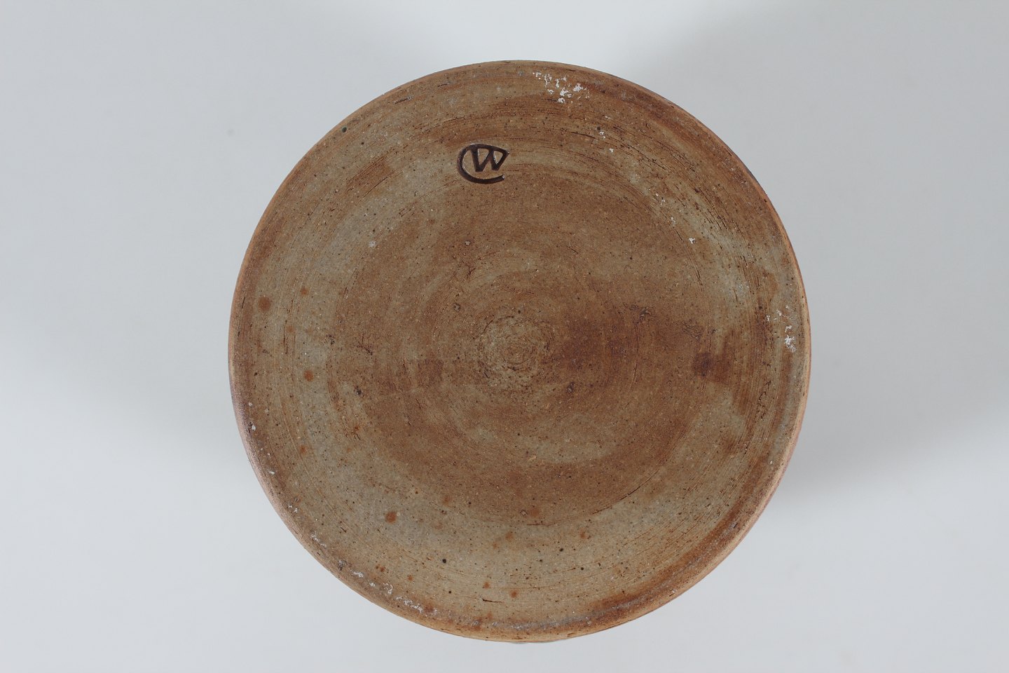 Conny Walther Bojanformet krukke af stentøj med abstrakt glasurdekoration Sign. monogram for Conny Walther fra hendes eget værksted Diameter 13 cm Højde 12,5 cm Fin stand uden skår eller rep.
