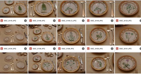 Flora Danica. Prinsesse Dagmars middagsservice af porcelæn dekoreret i farver og guld, bestående af: 12 middagstallerkener med forskellige blomster bl.a. 'Galeopsis Laudanum.L.' og 'Heleosciadium repens. Koch.', no. 3549, Ø ca. 25,3 cm, tre med hver et lille skår, 12 frokosttallerkener med forskellige blomster bl.a. 'Pulsatilla vulgaris Lob.' og 'Lathyrus silvestris. L.', no. 3550, Ø ca. 22,2 cm, seks med små skår samt en med hårrevne, stort ovalt fad med 'Trollius europæus.L.', no. 3519, L. 45 cm, stort ovalt fad med 'Carduus nutans.L.', no. 3519, L. 44,8 cm, kant med lille skår, 11 asietter med bl.a. 'Polygala depressum. L.' og ' Cerastium tetrandrum. Curtis.', no. 3552, Ø 14,2 cm, fem med små skår, oval skål med 'Lysimachia vulgaris. L.', no. 3506, L. 24,5 cm, lille tresidet skål med hank med 'Lonicera floribunda. L.', no. 3544, L. 21 cm, med to små skår og repareret hank, to ovale saucekander på underfade med grenhanke og pousserede blomster med bl.a. 'Fumaris micrantha. Lag.', no. 3556, L. ca. 24 cm, lille tresidet skål med låg og underfad med grenhank og pousserede blomster 'Viola tricolor L. d. arenaria. Sond.', no. 3575, H. 9 cm, stort ovalt lågfad med grenhanke og poussere blomster med 'Lavatera thuringiaca. L.', no. 3567, H. 18 L. 40 cm. Proveniens: Gave fra danske kvinder til prinsesse Dagmars (1890-1961) bryllup med Hofjægermester Jørgen Castenskiold (1893-1978) den 22.1.1922. Prinsesse Dagmar var datter af kong Frederik VIII (1843-1912) og dronning Lovisa (1851-1926) og var opkaldt efter sin faster og gudmor, kejserinde Dagmar (Marie Feodorowna) (1847-1928) af Rusland. Afbildet: Artikel om Herregården 'Kongstedlund' med interieurfotografier med prinsesse Dagmar og Jørgen Castenskiold, Dansk Familieblad 17. april 1962.