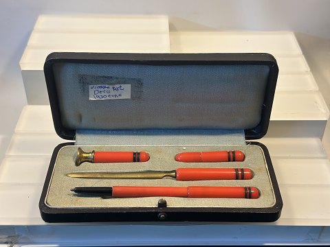 Skrivesæt art deco , fra 1930 erne , sætte består en pen ,en brevåbner og et blækhorn alt i rød farve og messingelementer