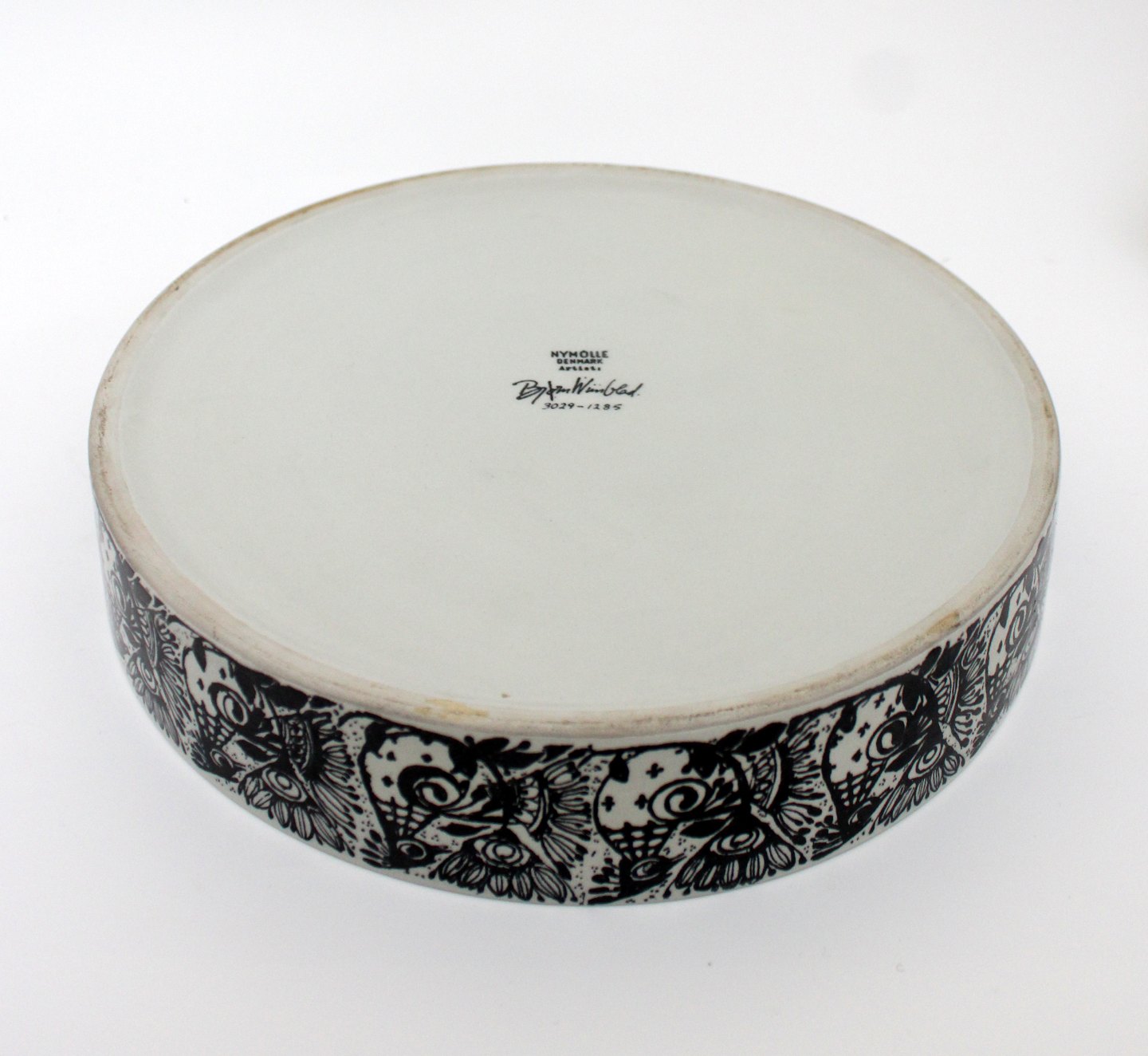 Frugtskål, Bjørn Wiinblad, Nymølle. Diameter 22 cm. Højde 4,5 cm. Der er lidt ujævnhed i glasuren på kanten ellers fin stand. Pris: 300 kr. stk. Lager: 1
