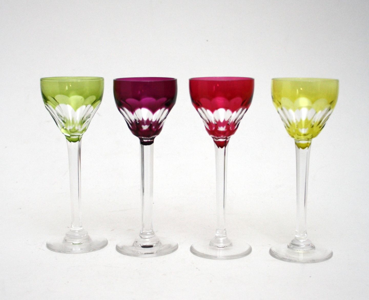 Val st. Lambert, Belgien, Tilly eksklusive krystal glas fra 1950-60 erne. Slibninger i kumme og på stilk. Portvin/snaps. Højde 12 cm. Lysegrøn, Lilla, rød og neongrøn. Alle i flot stand. Pris: 200 kr. stk.