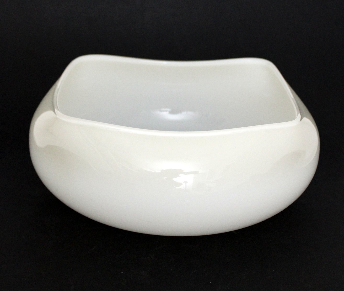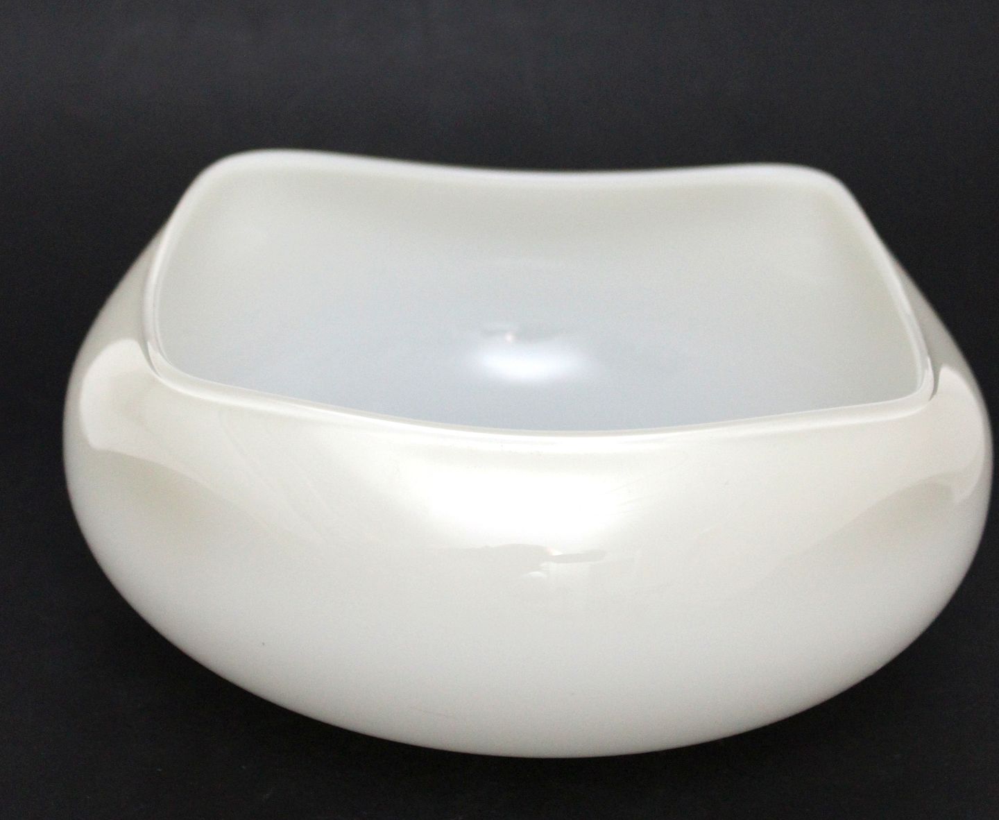 Holmegaard, Quadro Art glass. Cremehvid skål med firkantet top og kugleformet bund. Designet af Peter Svarrer i 2003. Quadro er en brugskunst serie i forskellige former og farver, der starter i 1998 og udgår af produktion i 2004. Skålen var dyr at fremstille pga. den firkantede top kombineret med den runde bund. Højde 10 cm. Diameter 22 cm. II sortering. Fin stand. Pris: 425 kr. stk. Lager: 1