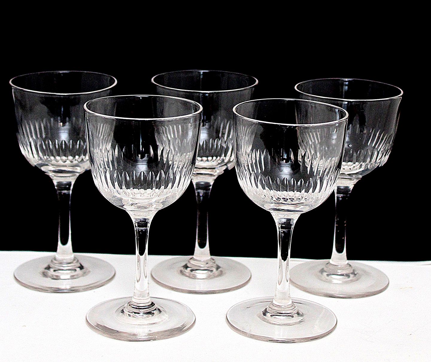 5 krystalvinglas med slibning nederst på kumme og glat stilk. Højde 12,5 cm. Diameter 6,5 cm. Lille hvidvin eller stor hedvin. Samt 1 stort snaps eller portvin. Højde 12,5 cm. Diameter 5 cm. Alle 6 glas pris: 475 kr.