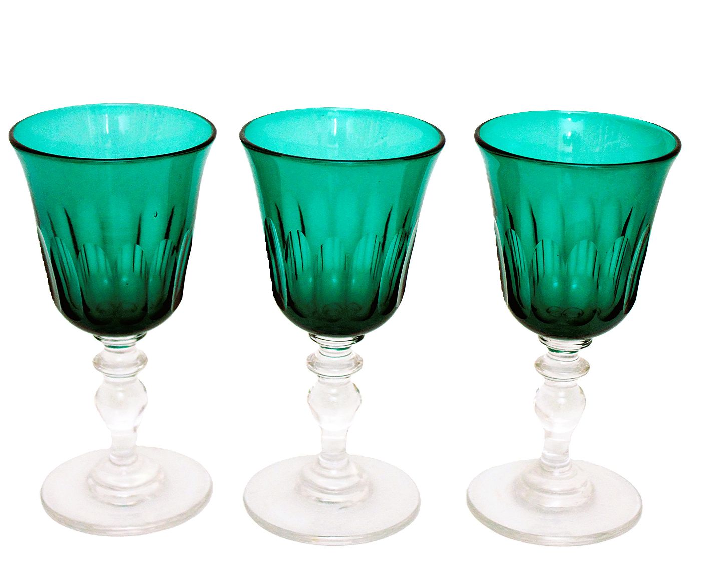 Petroleumsgrøn hvidvinsglas med olive slibning nederst på kumme og balusterstilk. Rundslebne i bund. Farven på foto rammer ikke helt, den er lidt lysere på foto. Højde 13 cm. Øverste diameter 6,5 cm. Pris samlet: 450 kr.