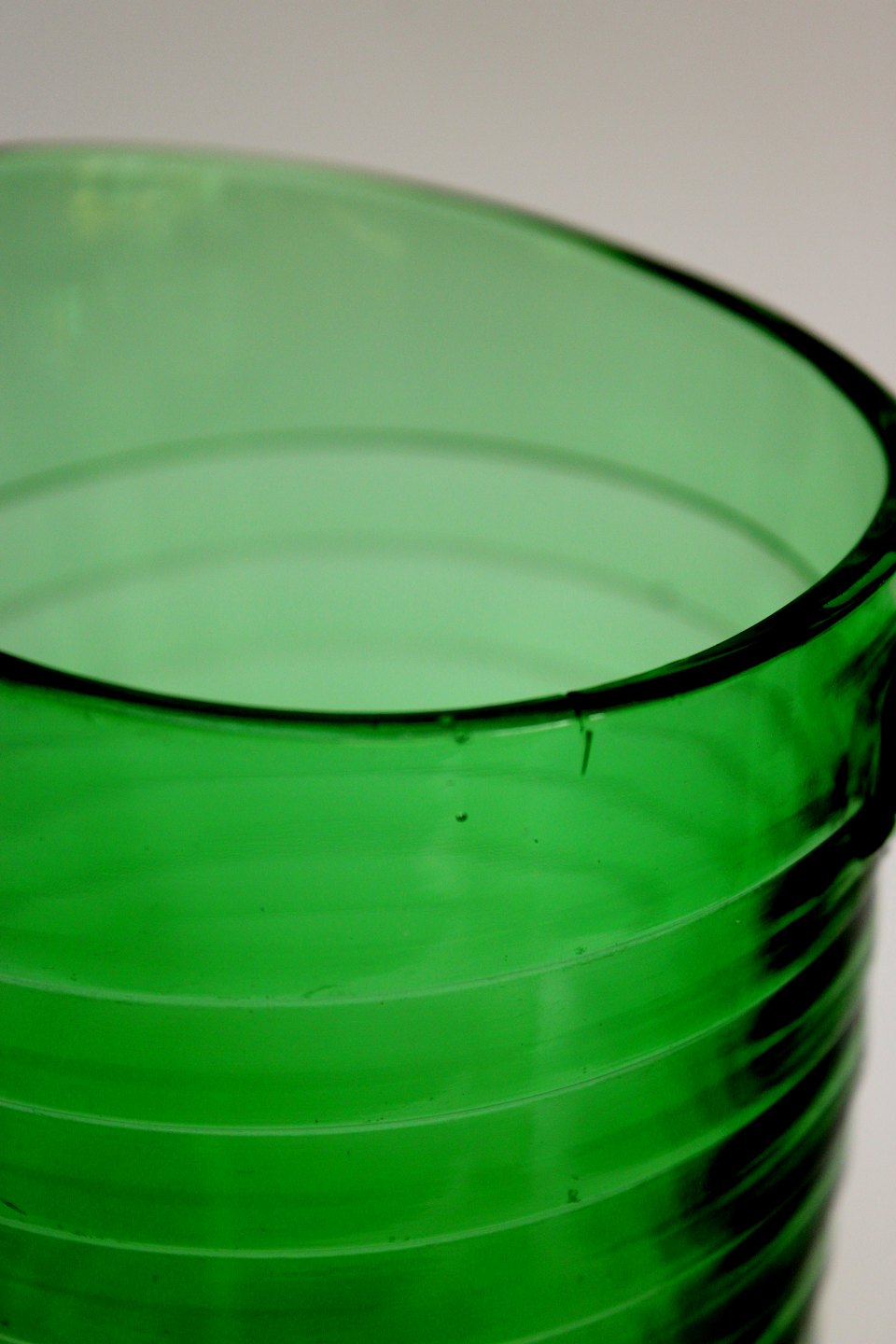Holmegaard, Broksø presset glas 1938-1941, designet af Jacob E Bang. Transparent grøn kande. Højde 17 cm. Længde 17 cm. Produktions fejl "revne" i kanten. Pris: SOLGT