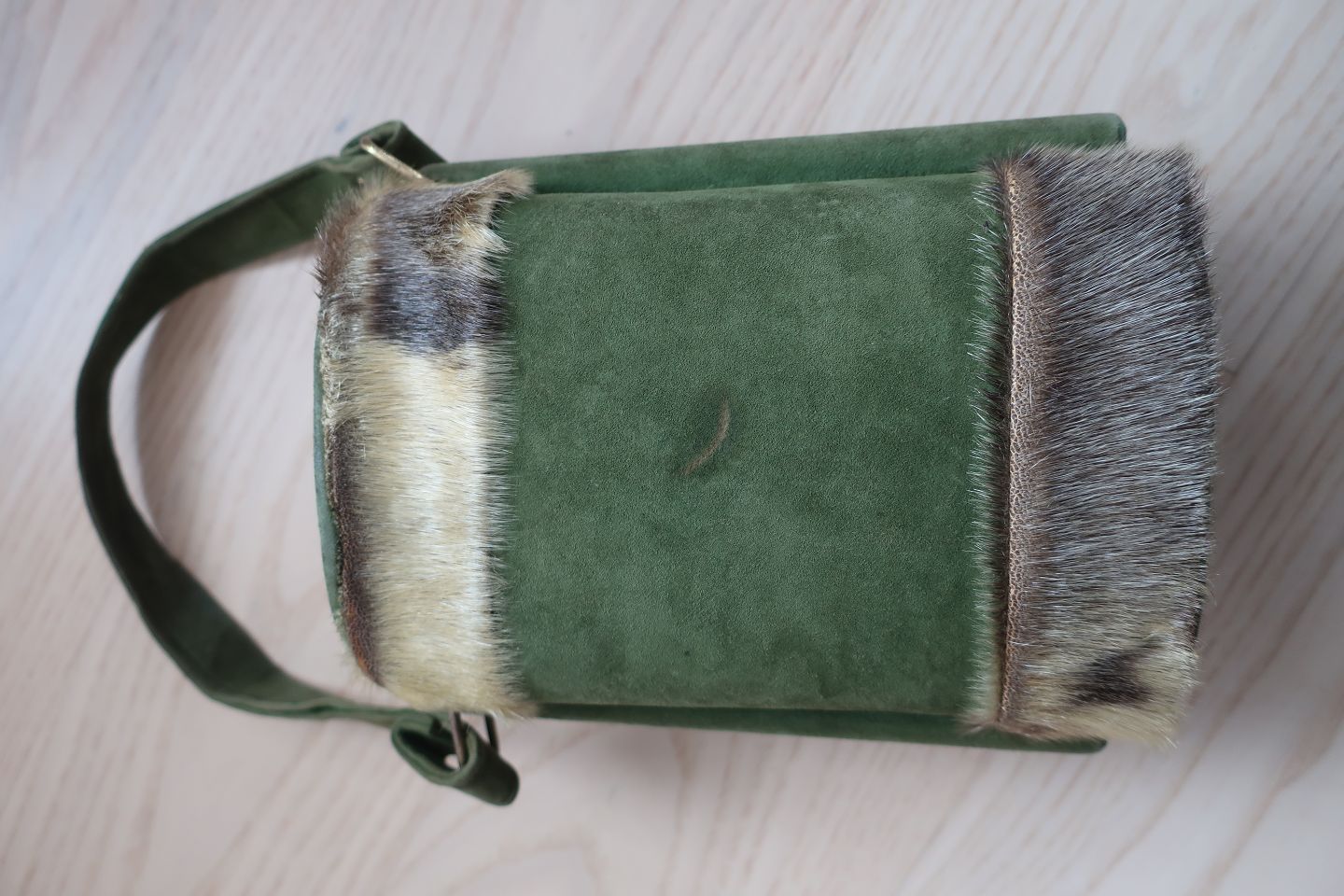 Vintage taske med skindbesætning Tasken anvendes på højkant Med rem God stand udvendig og indvendig, men med lidt slid på skindet Varenr.: 4-11162