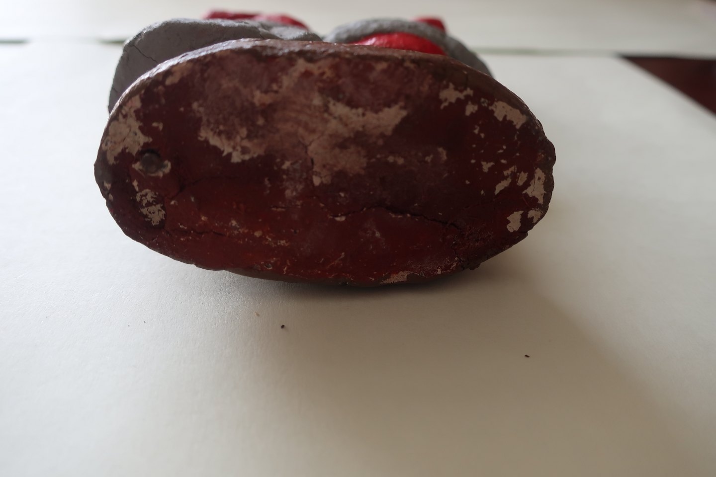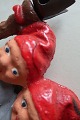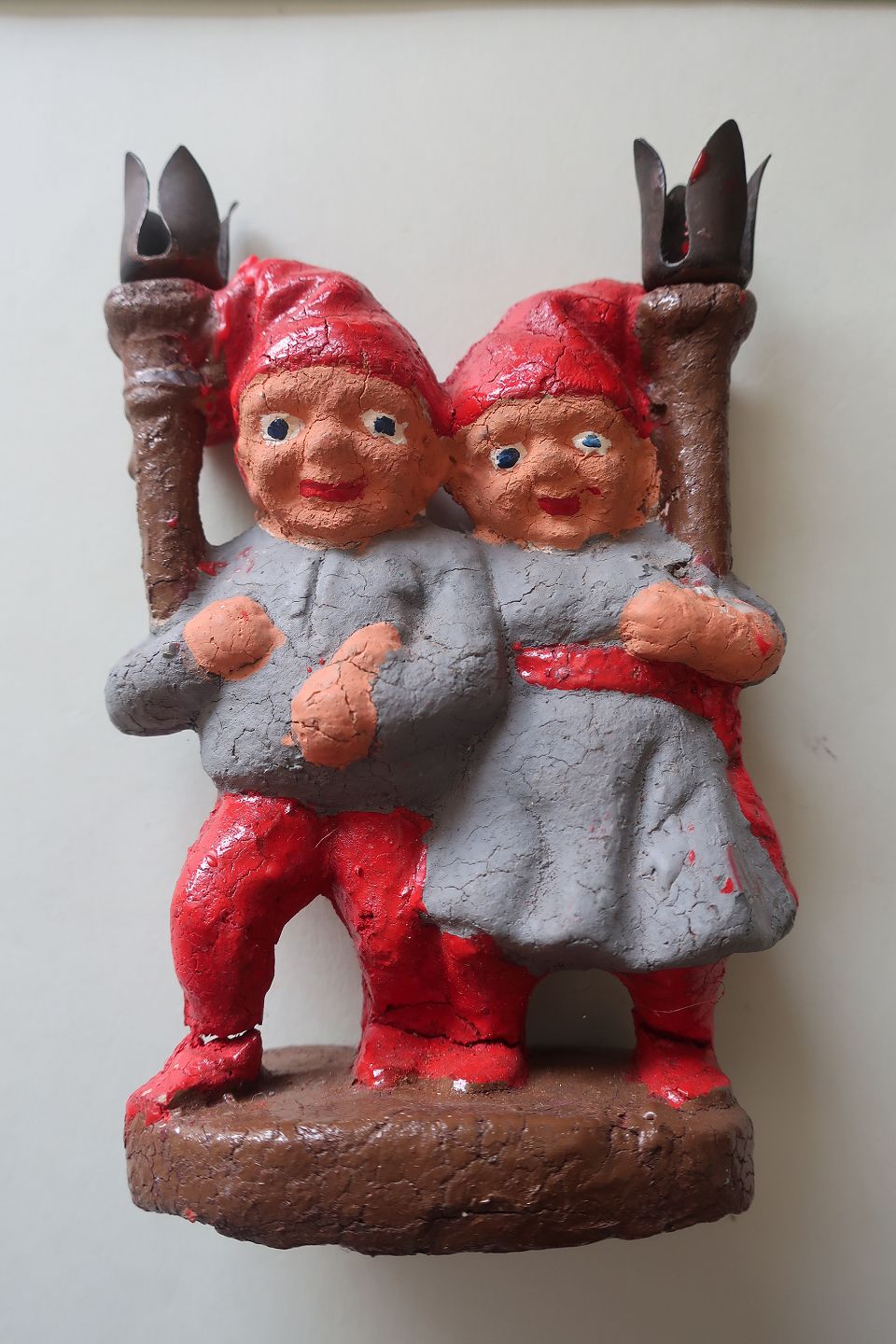 2 gamle lysestager i form af nissefar og nissemor med lysetager som fakler (lavet af metal)